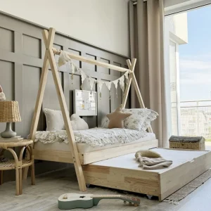 Lit simple tipi en bois avec barrière, entrée centrale • Milie