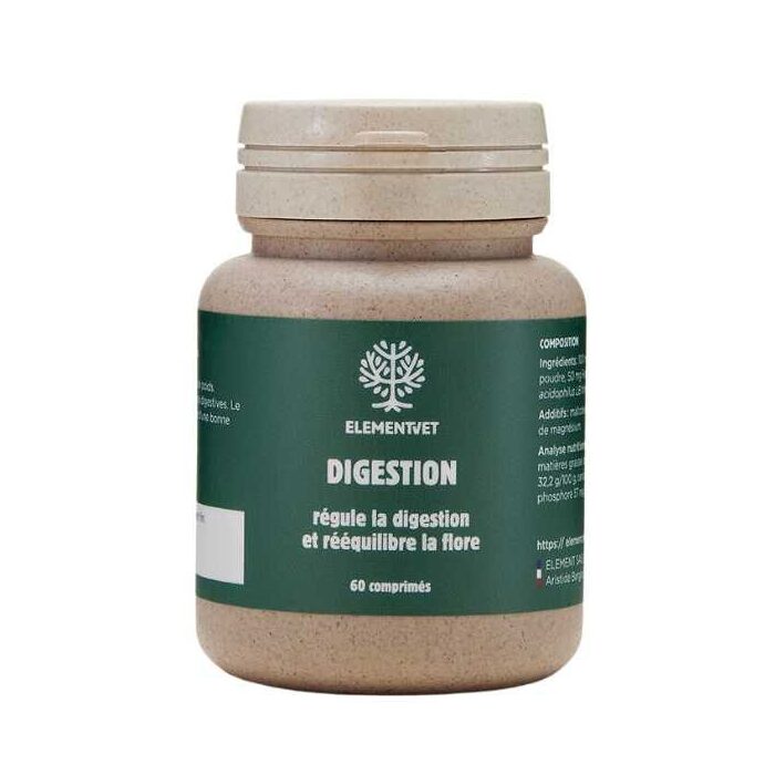 Découvrez les compléments alimentaires Digestion de la marque Element Vet. Des compléments alimentaires naturels pour réguler la fonction digestive et rééquilibrer la flore intestinale de votre chien (diarrhées, nettoyage de l’organisme, gaz, ballonnements, etc).