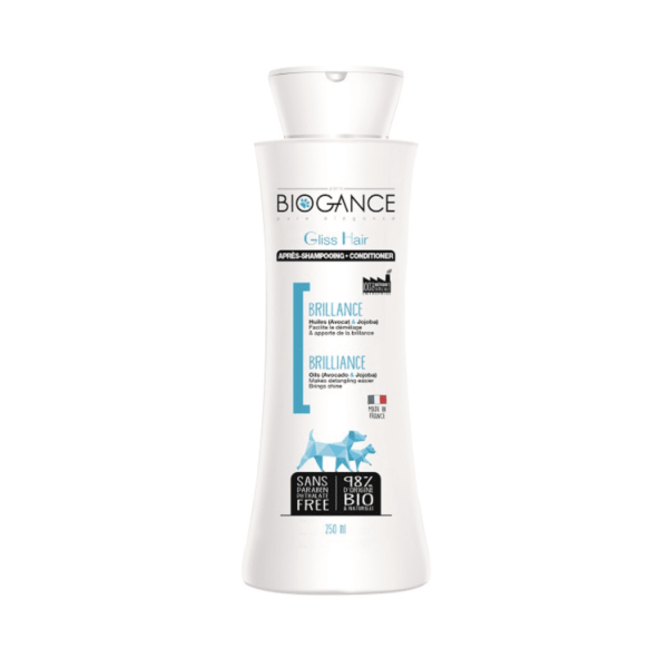 Découvrez l’après-shampoing Biogance, composé à 98% d’ingrédients d’origine bio et naturelle. Formulé à base d’huile de jojoba et d’huile d’avocat, il nourrit, démêle, lisse tout en apportant de la brillance au pelage de votre chien.