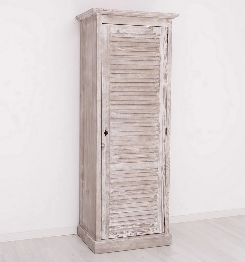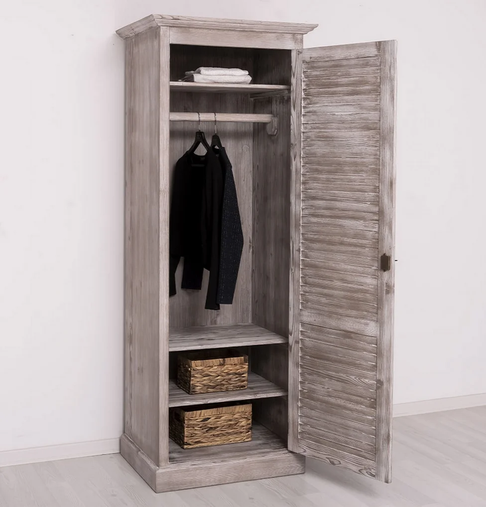 Armoire 1 porte penderie avec une porte persienne en pin massif de couleur lasuré grisé