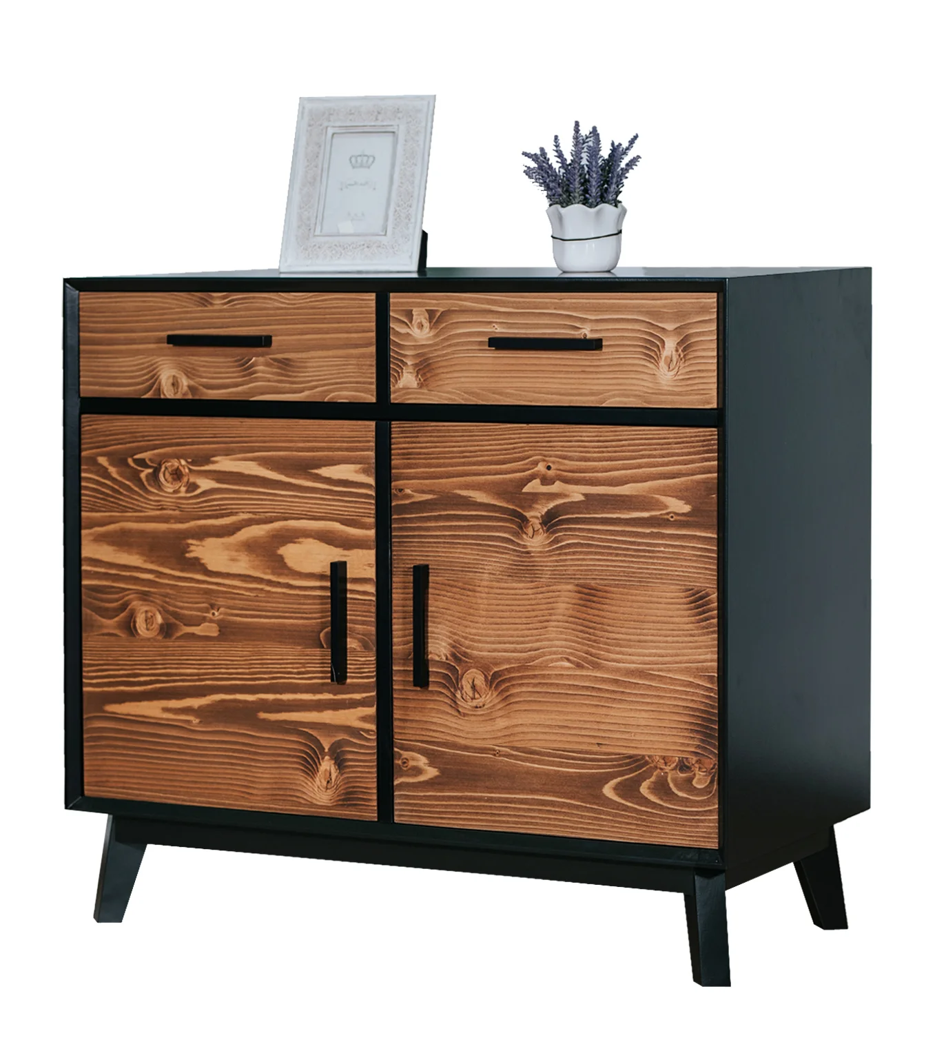 Petit bahut bas 2 tiroirs et 2 portes structure en en MDF laqué noir anthracite, façade des tiroirs en pin massif brossé et huilé ton miel foncé, ce bahut bas fait parti de la collection Nostalgie avec une finition soit en pin massif brossé sur toute la surface ou en finition identique à ce modèle mais une finition MDF blanc.