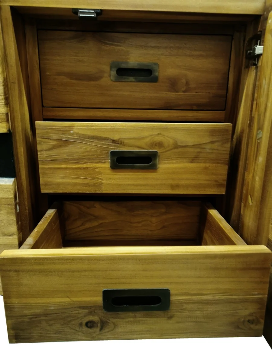 Derrière la porte de droite trois tiroirs sur rails coulissants