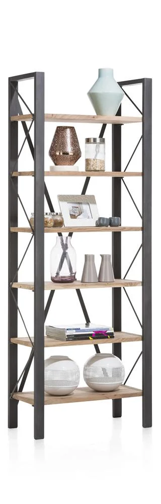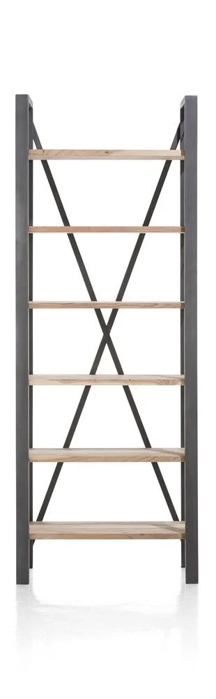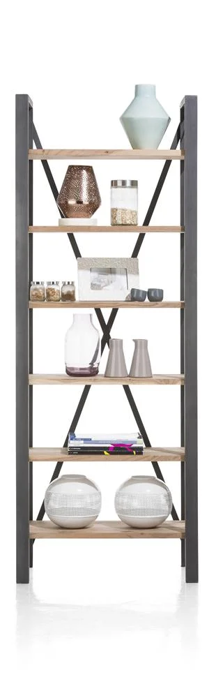 Bibliothèque haute en Kikar massif et placage, couleur naturel, Avec sa ligne épurée, pieds et traverses en métal, cette magnifique bibliothèque s’intégrera parfaitement dans un intérieur moderne et lumineux.