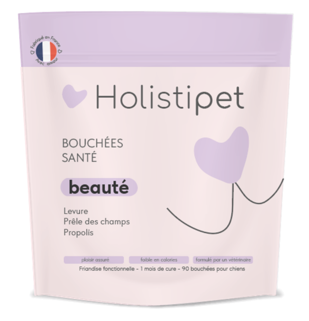 Découvrez les bouchées santé beauté Holistipet, pour favoriser un belle peau et un beau pelache à votre chien.