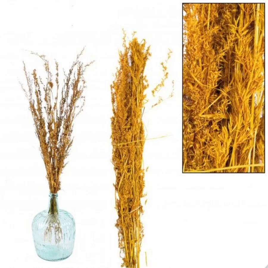 Set de dix branches d’ herbe d’Alfonso naturel couleur safran, avec de longue tige et plumeau d’une douceur naturel. Ces herbes sont livrées sur tige et par sachet de dix tiges environ est donc être utilisée en multiple dans un pot ou vase ou combinée avec des herbes en pot. Ces herbes rendent très bien en vase, dans un pot ou dans des bacs décoratifs comme séparateurs d’espaces.