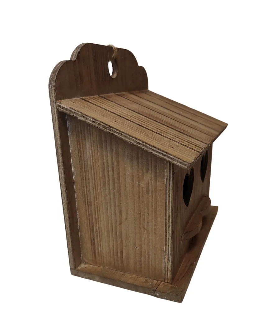 Jolie ensemble de maisonnette pleine de charme…Ce nichoir est conçu pour une fixation murale….Equipé de deux ouverture en forme de coeur, ce nichoir en pin brut huilé fera un foyer idéal pour jeune couple en désir d’enfants.