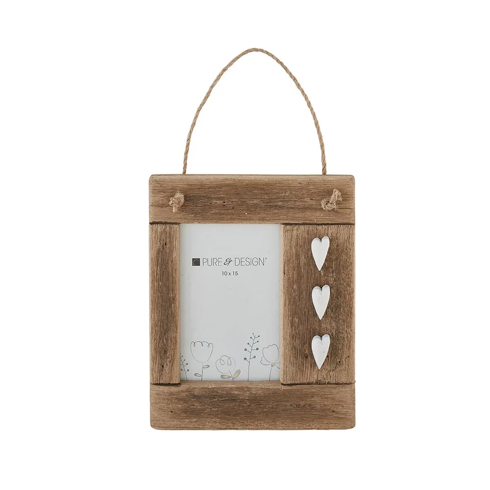 Cadre avec trois petits cœurs en bois blanc sur le coté.