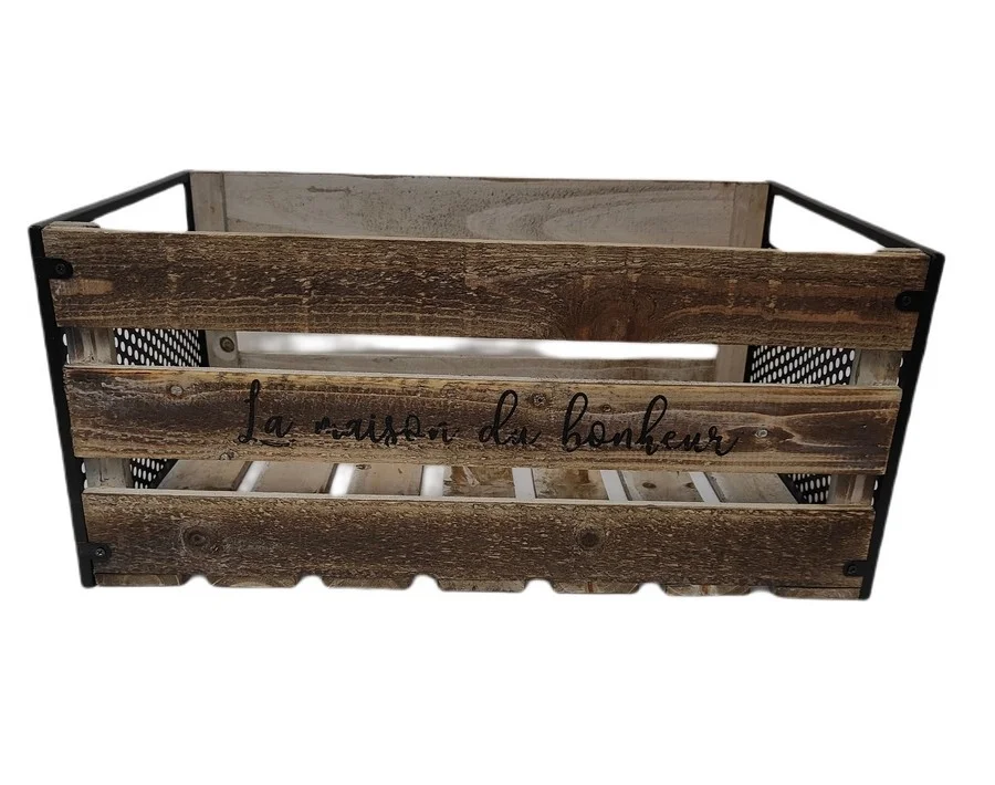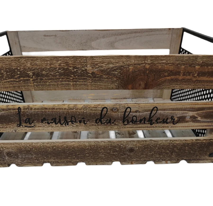 Authentique et originale, choisissez cette caisse en bois et métal grillage noir sur les cotés, et son inscription « La maison du bonheur ».