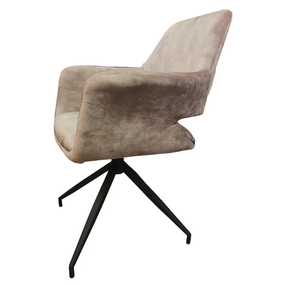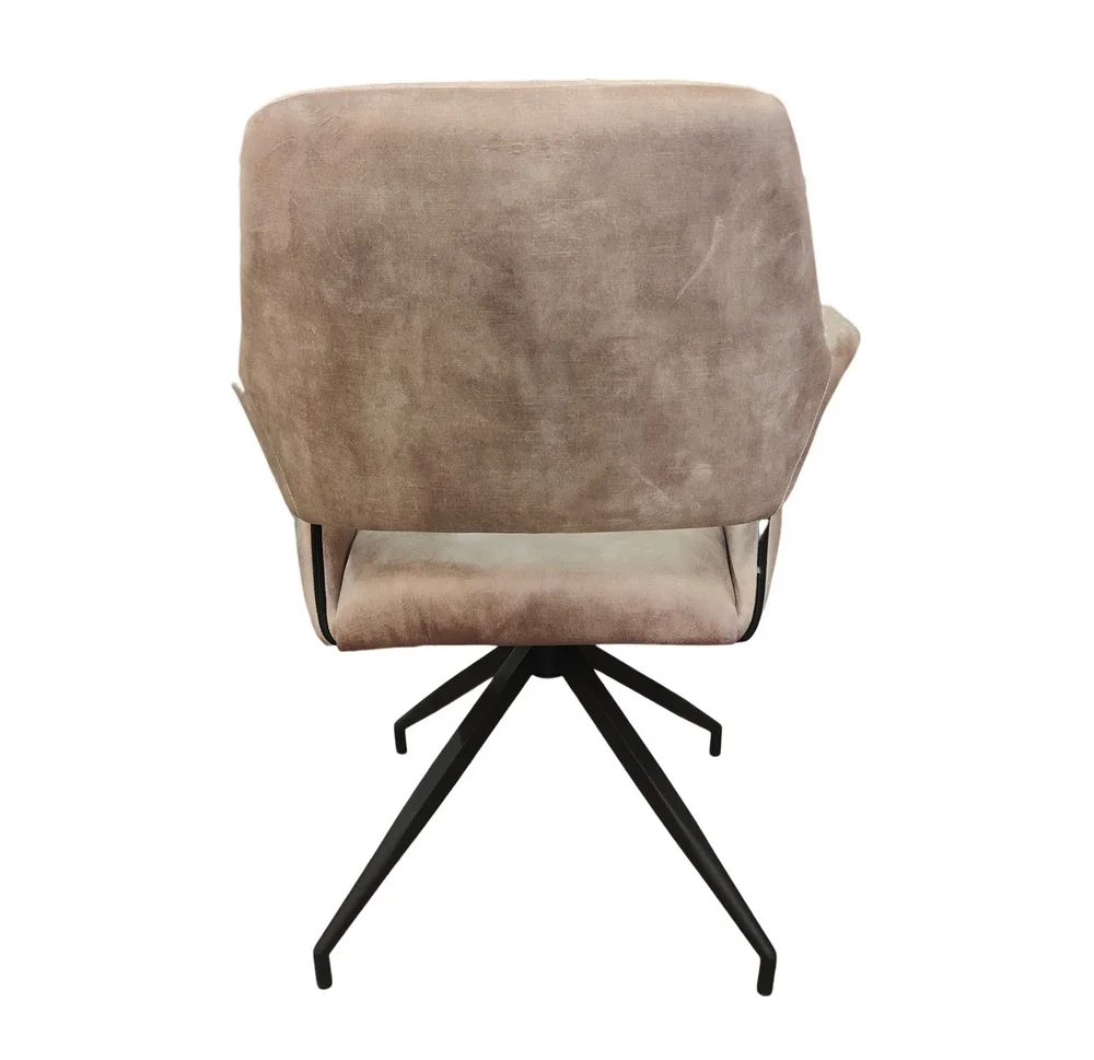 Découvrez les nouvelles chaises Katy très originales et élégantes avec accoudoir et avec une assise pivotante à 180 degré; Recouverte d’un tissu velours couleur Beige