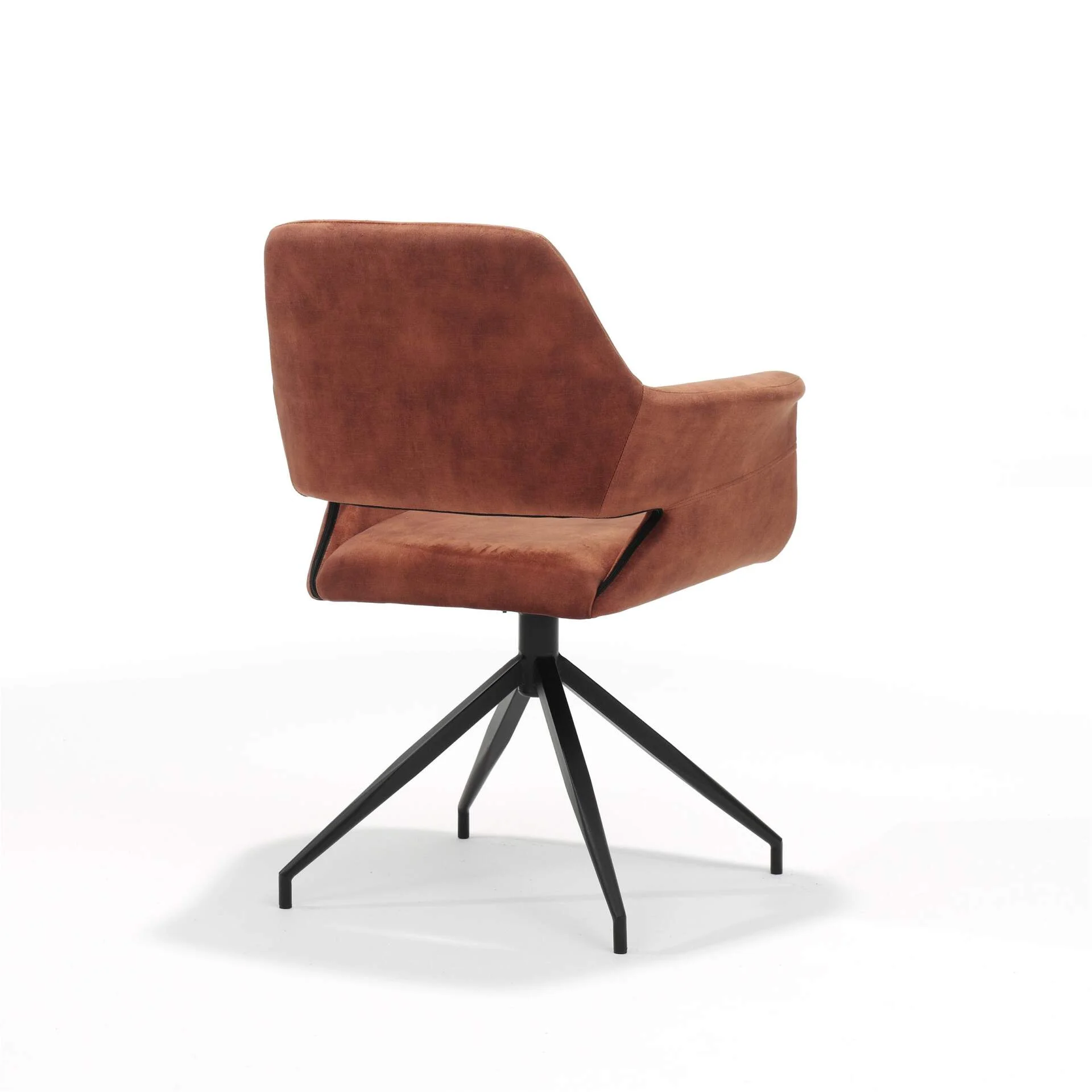 Découvrez les nouvelles chaises Katy très originales et élégantes avec accoudoir et avec une assise pivotante à 180 degré; Recouverte d’un tissu velours couleur Rouille