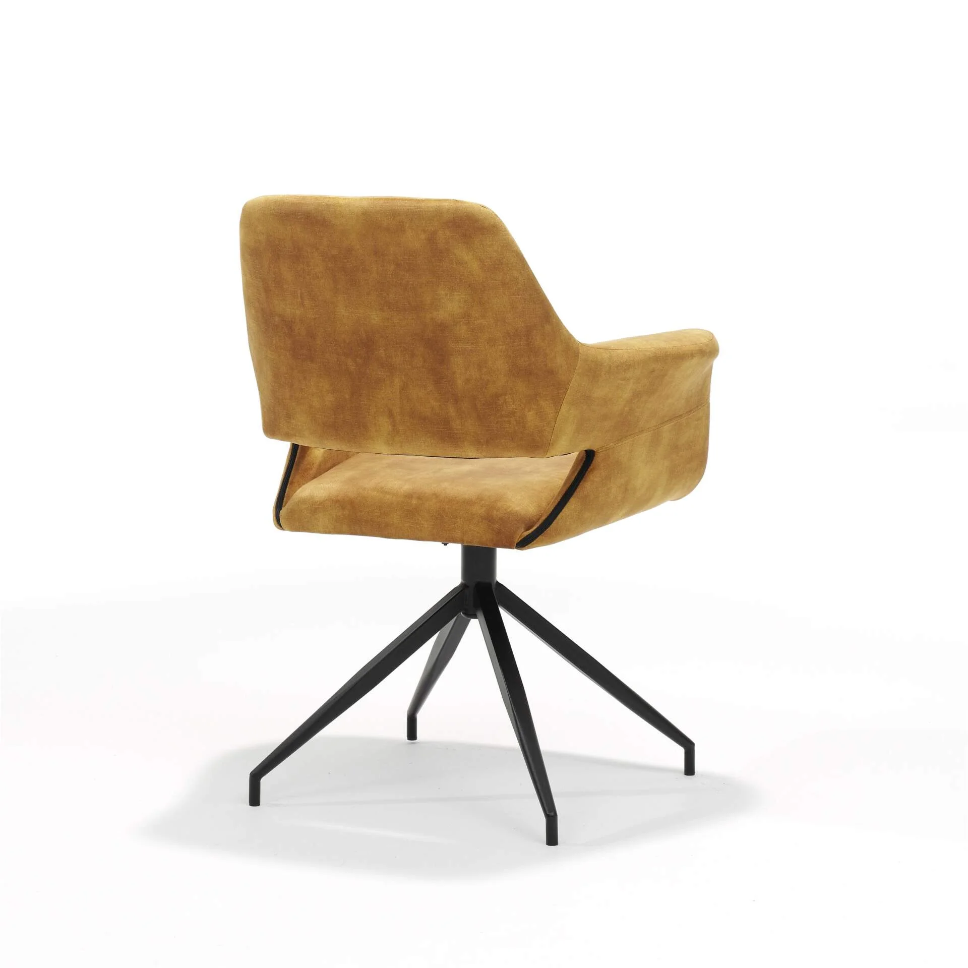Découvrez les nouvelles chaises Katy très originales et élégantes avec accoudoir et avec une assise pivotante à 180 degré; Recouverte d’un tissu velours couleur doré