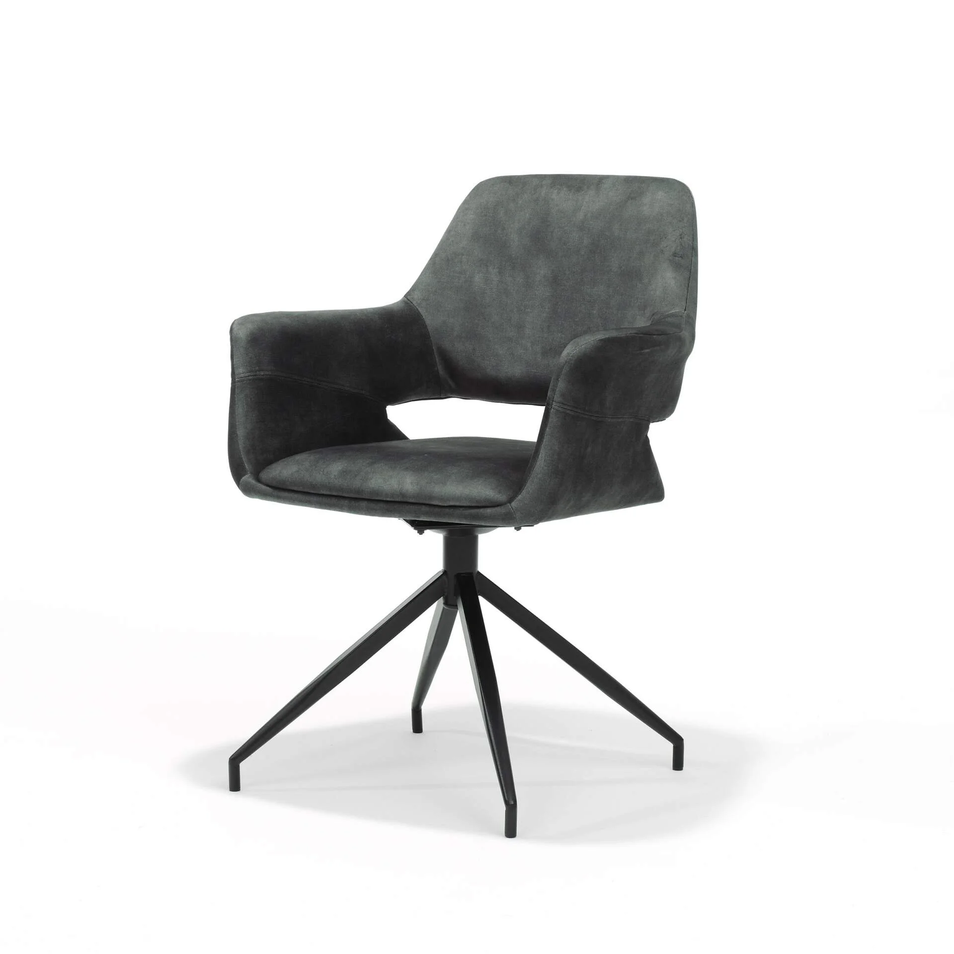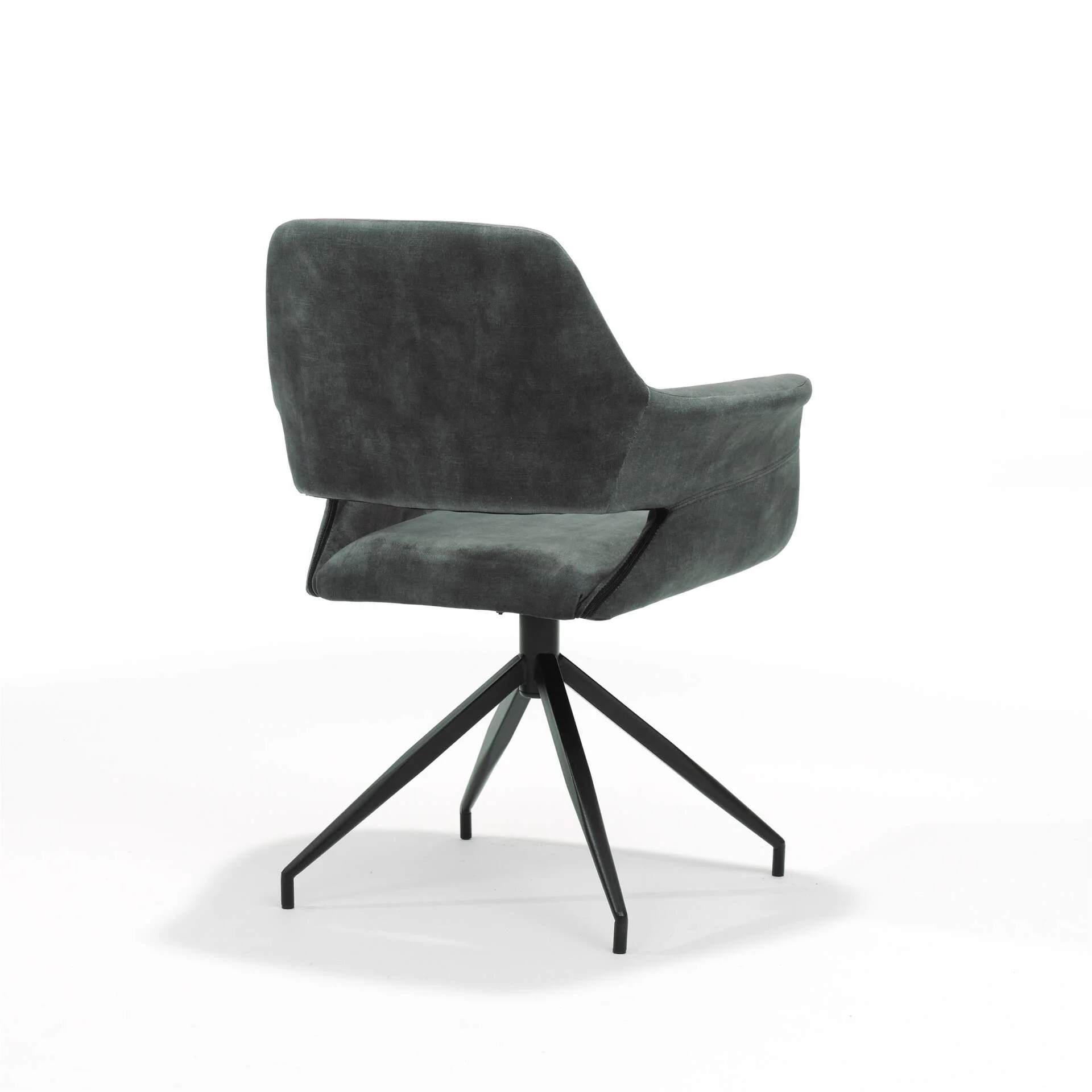 Découvrez les nouvelles chaises Katy très originales et élégantes avec accoudoir et avec une assise pivotante à 180 degré; Recouverte d’un tissu velours couleur kaki