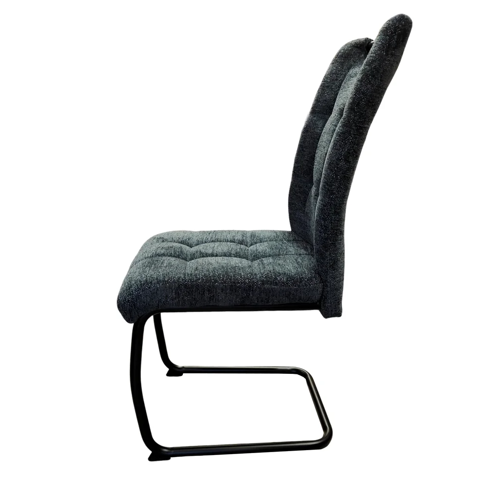 Chaise WADRO, chaise pied luge en métal noir – Assise et dossier en tissu Anthracite moucheté 100% polyesther – Garniture d’assise en mousse polyésther densité 36 Kg/M3 pour l’assise et 27 Kg/m3 pour le dossier – Piétement acier noir vieilli –