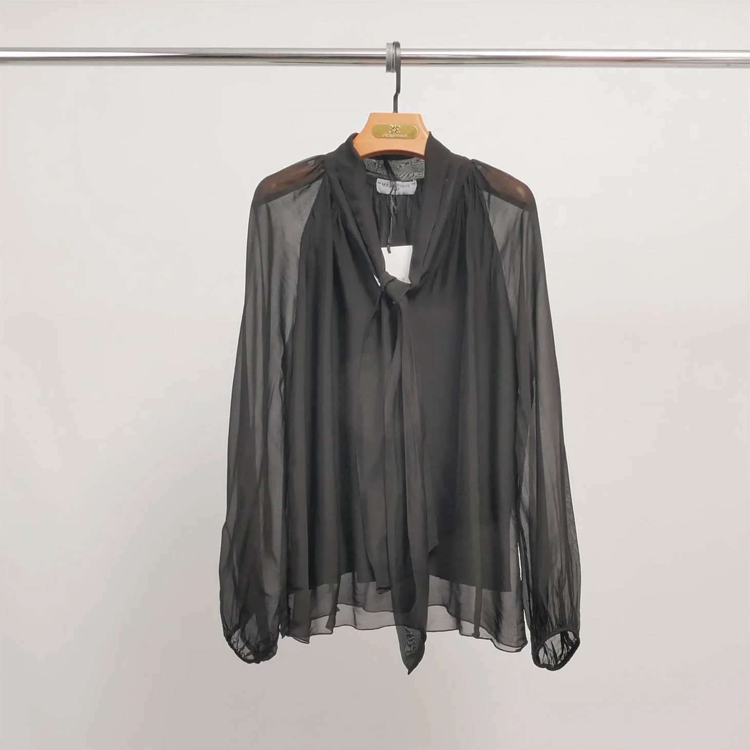 Élégance et légèreté s’entrelacent dans cette chemise fluide au charme intemporel. Son col lavallière à nouer apporte une touche sophistiquée, tandis que sa matière semi-transparente subtilement satinée sublime chaque mouvement. Les manches longues légèrement bouffantes et resserrées aux poignets renforcent son allure féminine et raffinée. Parfaite pour rehausser un pantalon tailleur au bureau ou une jupe fluide en soirée, elle s’adapte à toutes les occasions avec une grande finesse.