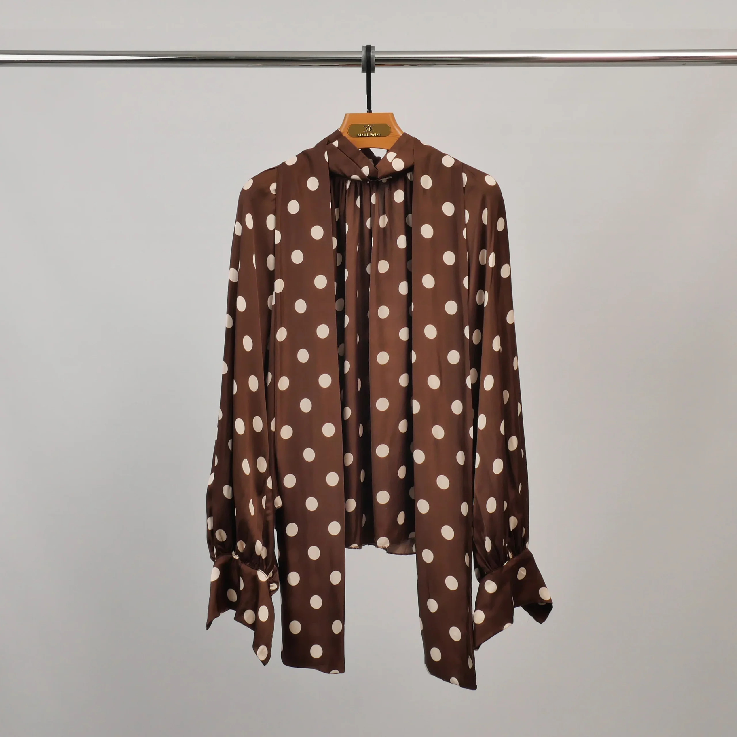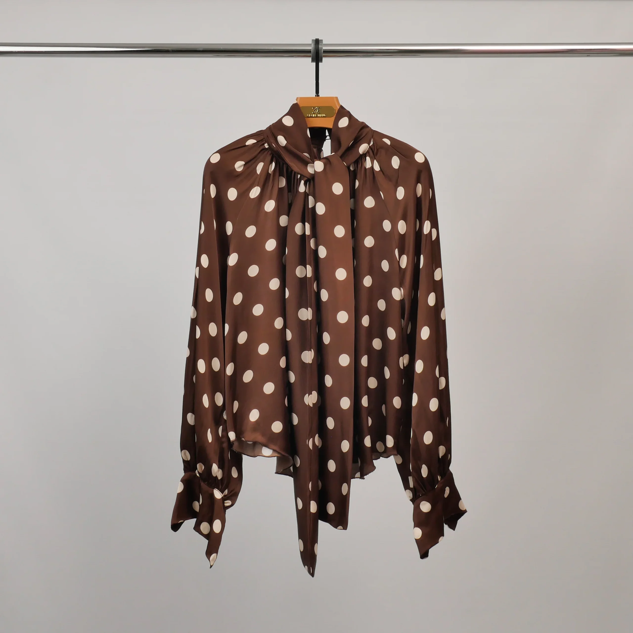 Élégante et pleine de caractère, cette chemise satinée à pois revisite le classique col lavallière avec une touche vintage affirmée. Son tissu fluide en satin de viscose met en valeur un imprimé à pois intemporel sur fond chocolat, tandis que les manches longues à poignets noués ajoutent une note sophistiquée. La coupe ample assure un tomber souple et flatteur, idéal pour allier confort et allure. Portez-la rentrée dans un pantalon taille haute pour un look chic de bureau, ou laissez-la fluide sur un jean pour une silhouette plus décontractée mais toujours raffinée.