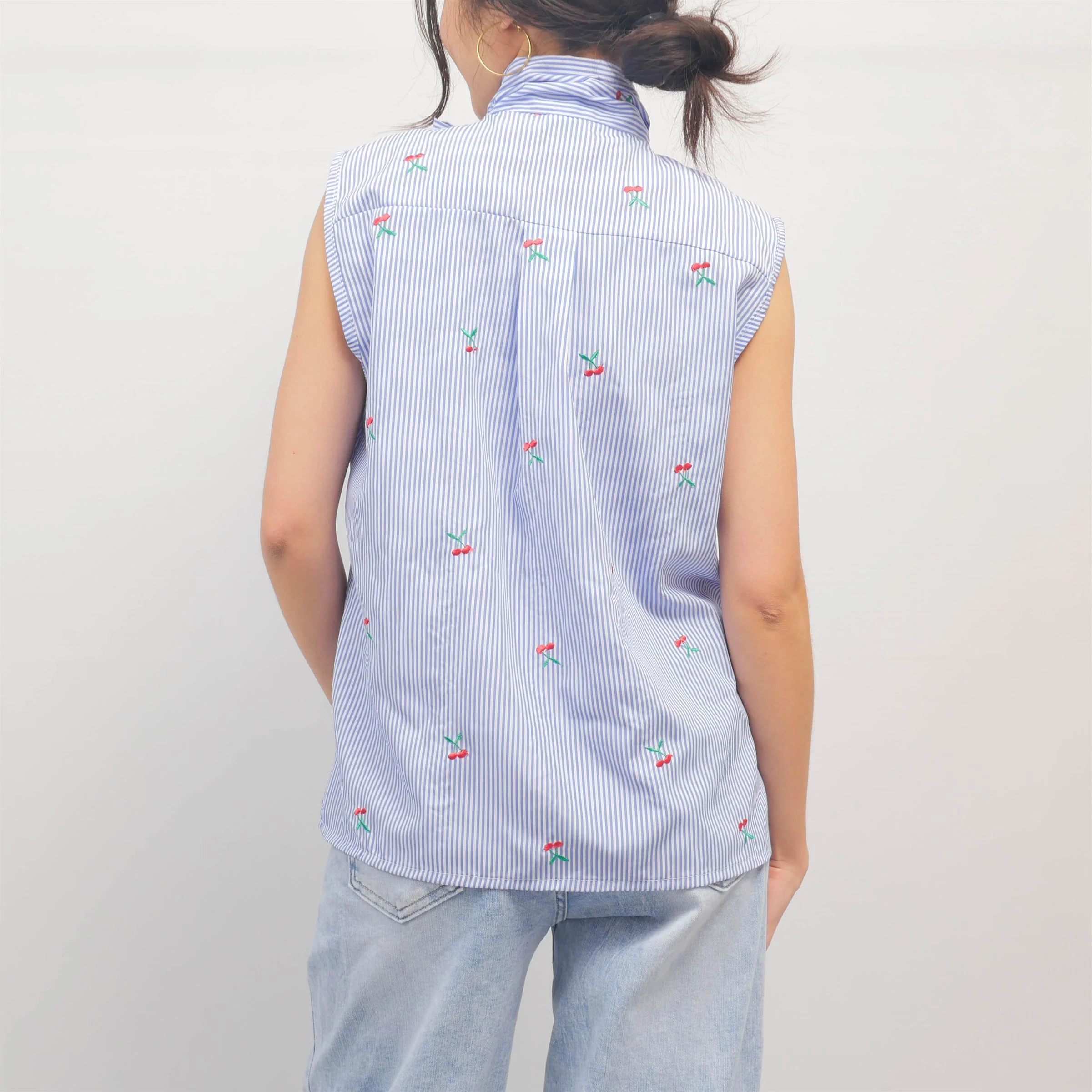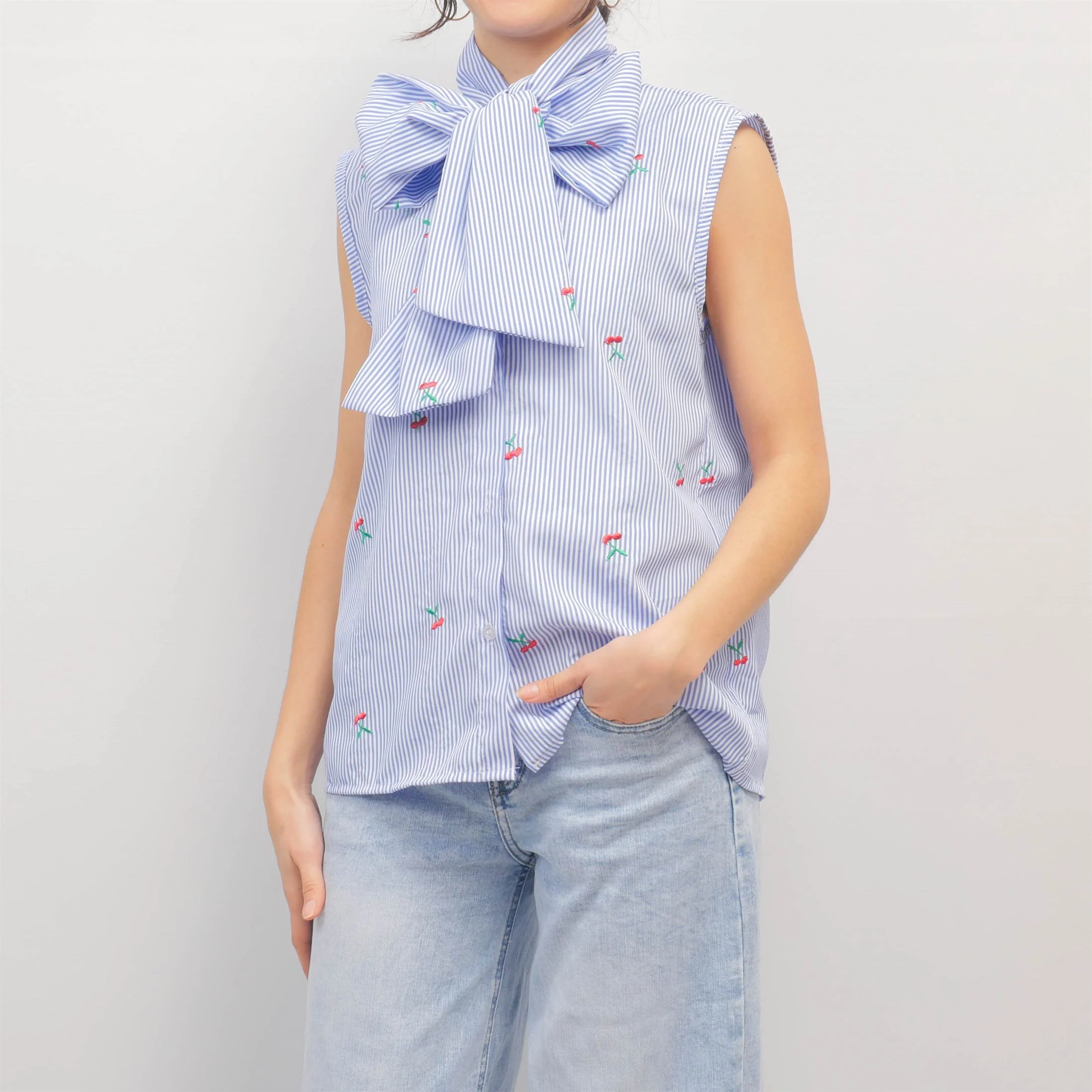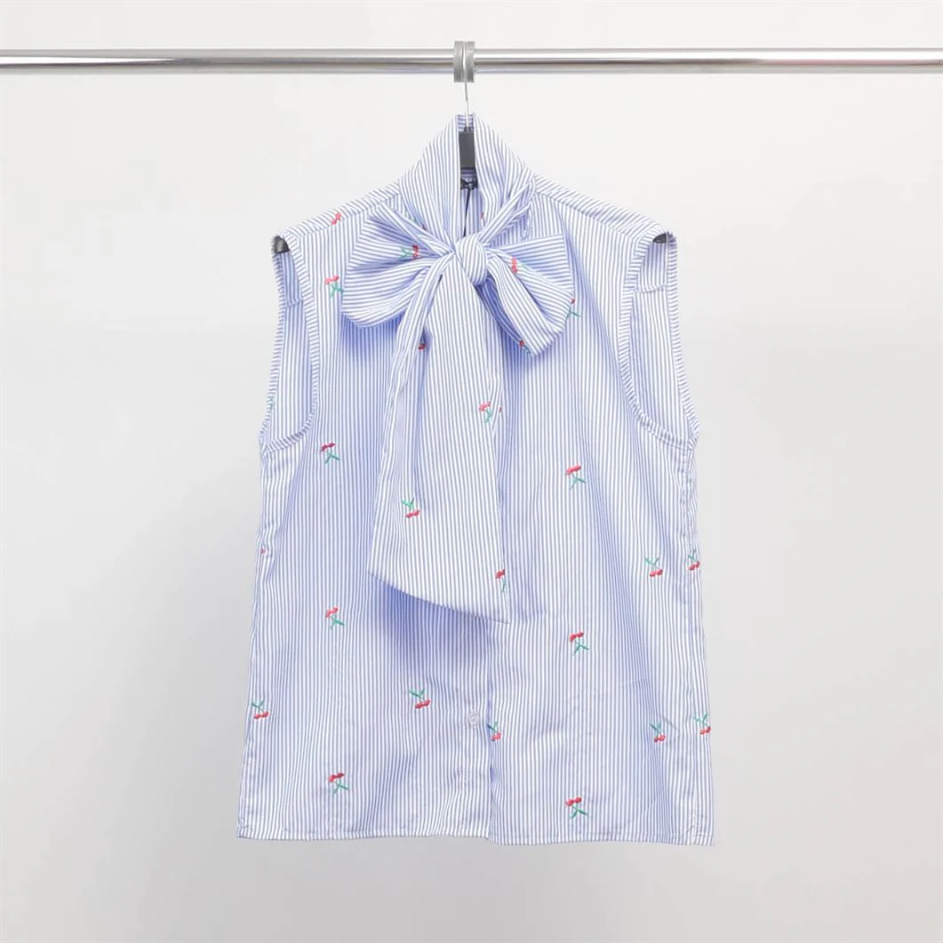 Ce chemisier sans manches joue la carte du raffinement avec son large nœud lavallière et son tissu rayé bleu et blanc délicatement brodé de petites fleurs colorées. Sa coupe droite légèrement ample et son tissu légèrement stretch assurent un porté confortable, tandis que les finitions soignées renforcent son allure élégante.