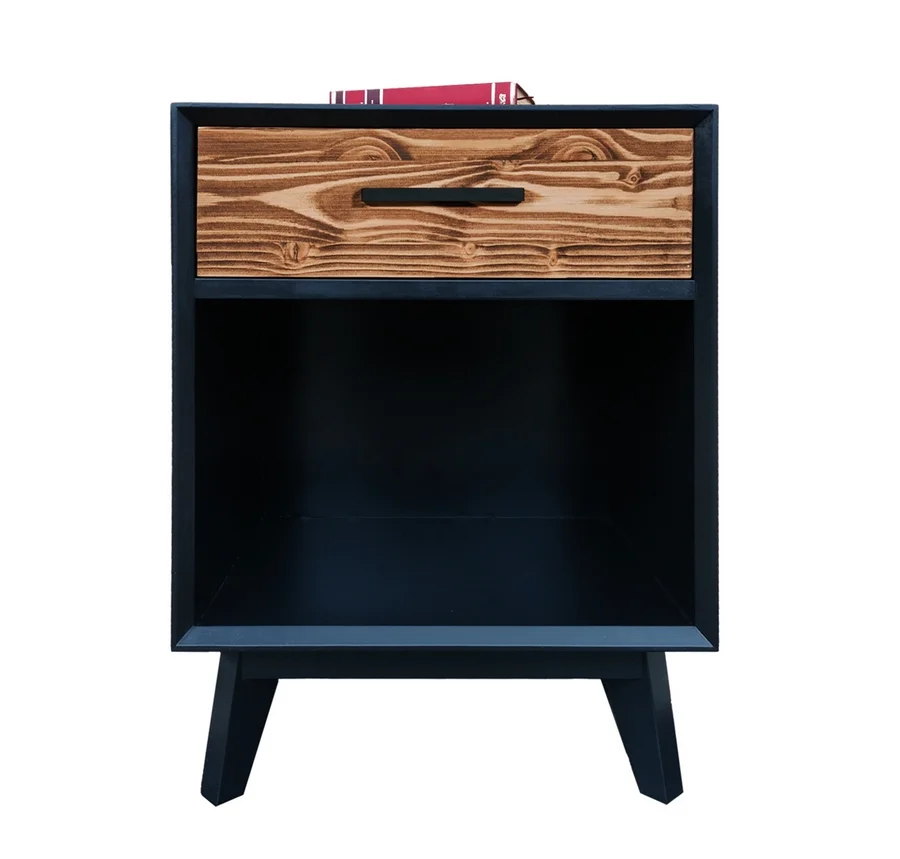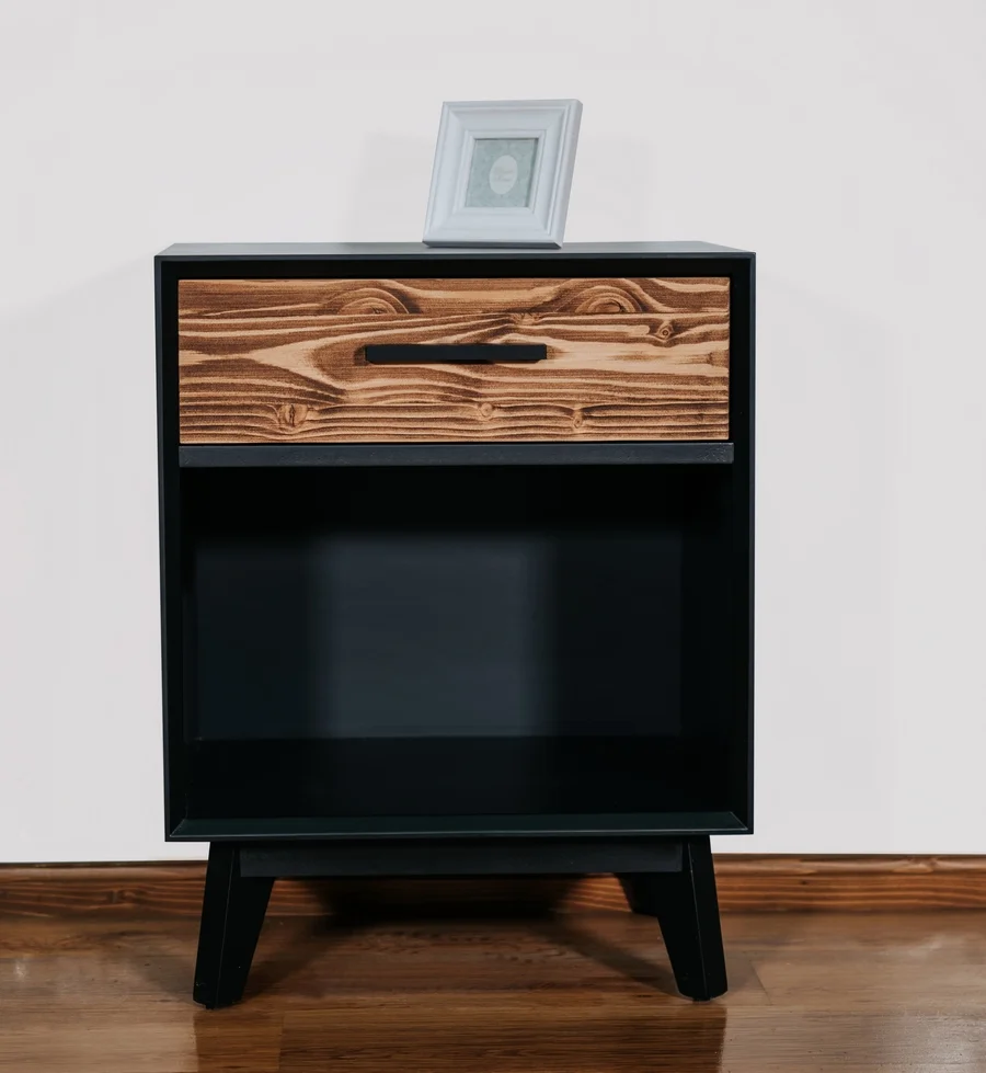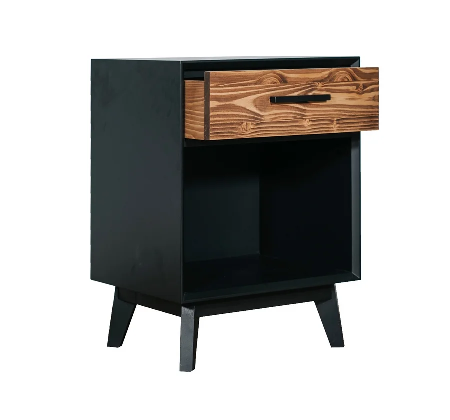 Chevet 1 tiroir et 1 niche structure en en MDF laqué noir anthracite, façade des tiroirs en pin massif brossé et huilé ton miel foncé, ce chevet fait parti de la collection Nostalgie avec une finition soit en pin massif brossé sur toute la surface ou en finition identique à ce modèle mais une finition MDF blanc.