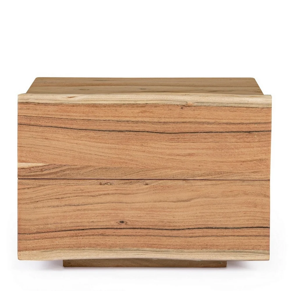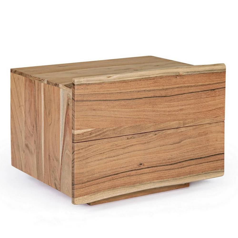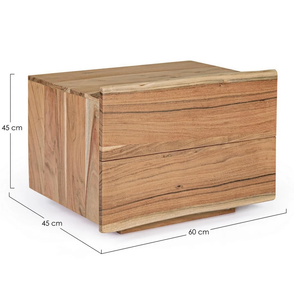 Chevet de la collection Aron une création de la marque Italienne Bizzotto structure en acacia massif vernis équipé de deux tiroirs ouvertures totale sur rails métal; Un chevet en acacia pour une chambre originale