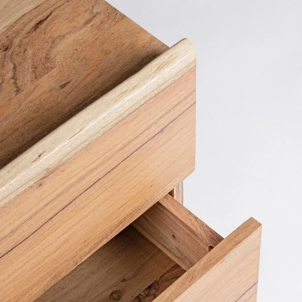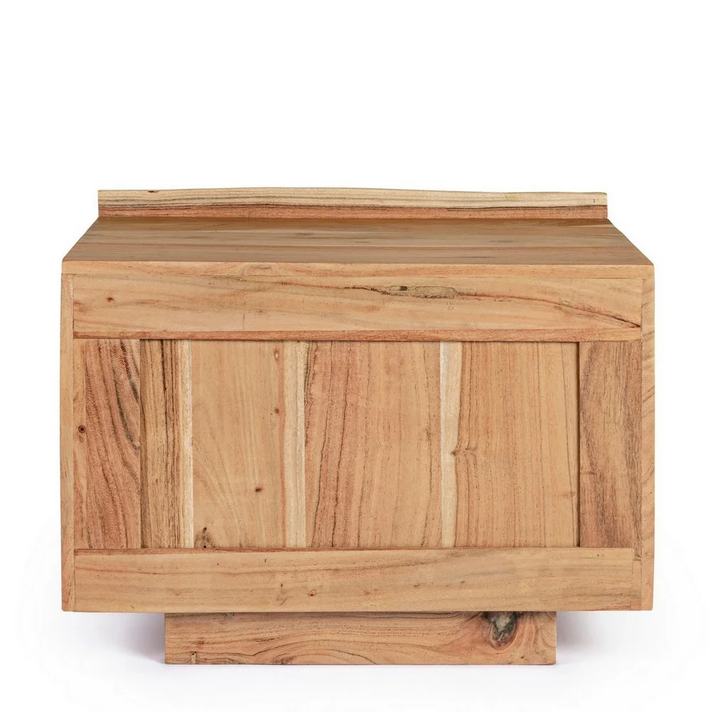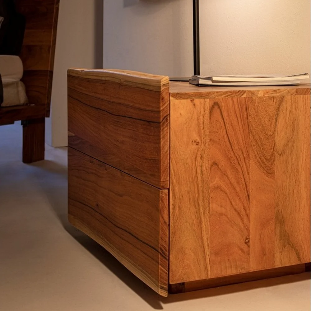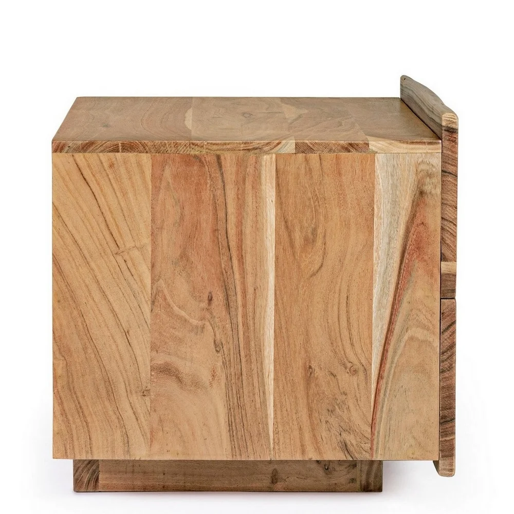 Chevet de la collection Aron une création de la marque Italienne Bizzotto structure en acacia massif vernis équipé de deux tiroirs ouvertures totale sur rails métal; Un chevet en acacia pour une chambre originale