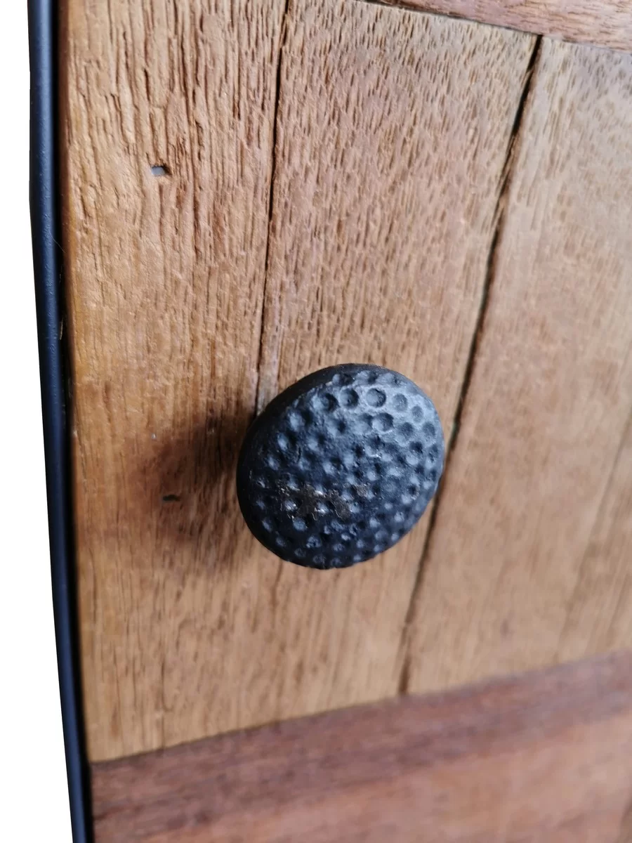 Chevet, structure en métal noir vieilli et en façade une porte sur charnière en palissandre massif