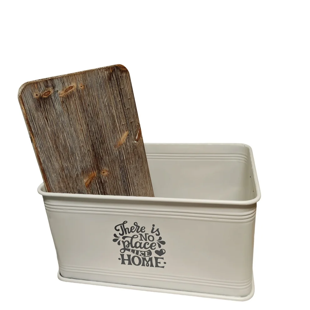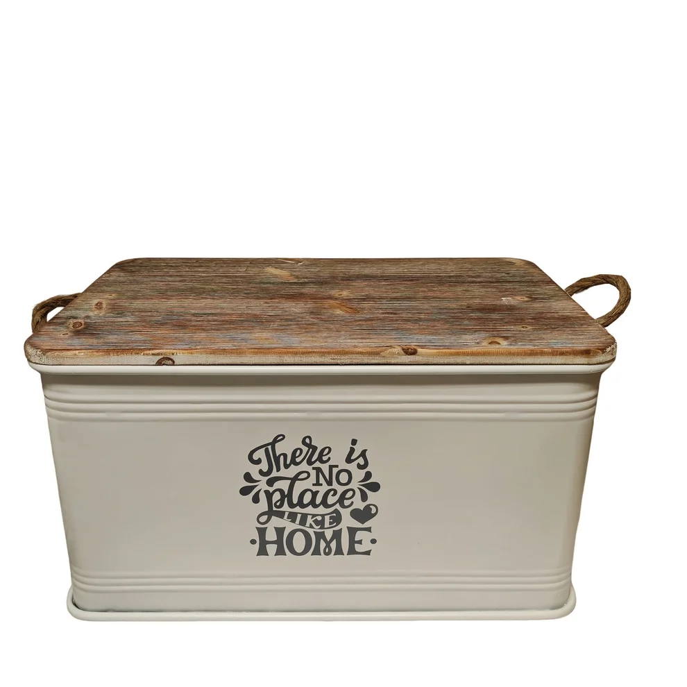 Ce joli coffre déco « There is no place like home » en métal blanc et bois massif vieilli.