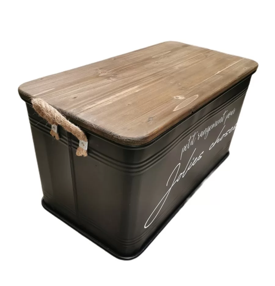 Coffre de rangement qui marie à merveille le sapin massif vieilli et le fer noir avec des points d’oxydation.