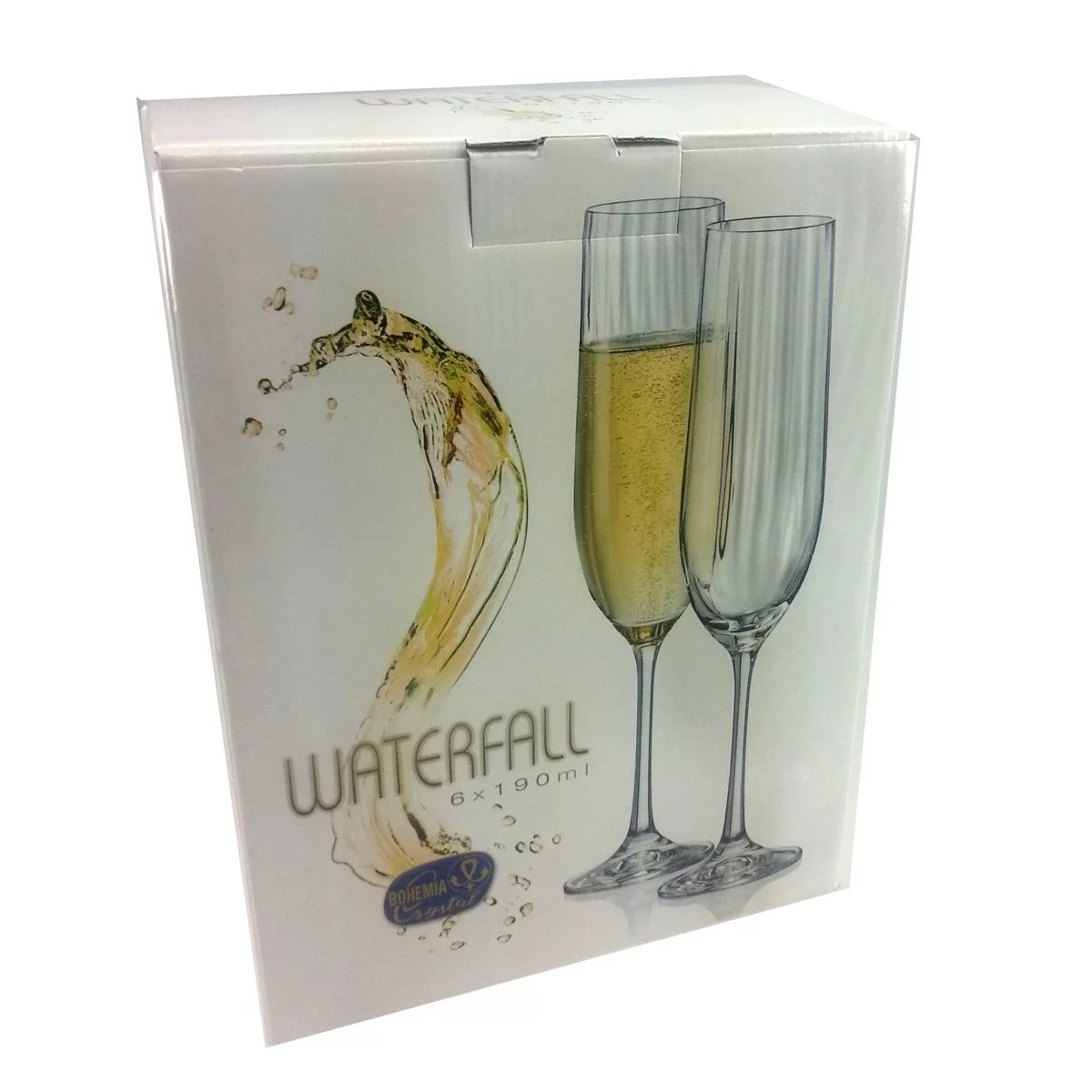 La gamme Waterfall regroupe des verres avec une apparence ondulée. Cristallin. Garantie lave vaisselle. Magnifiques et majestueux, ils donnent à votre table une élégance sans égal. Set de 6 flutes à champagne. Contenance 190ML. Boite photo cadeau. Fabriqué en Euope de l’Est.