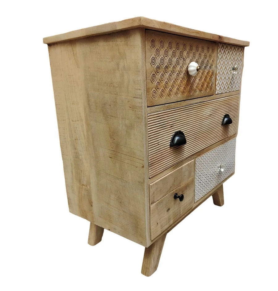 Commode 5 tiroirs en manguier massif blanchi et un décor différents sur chacun une création de chez Ascot.