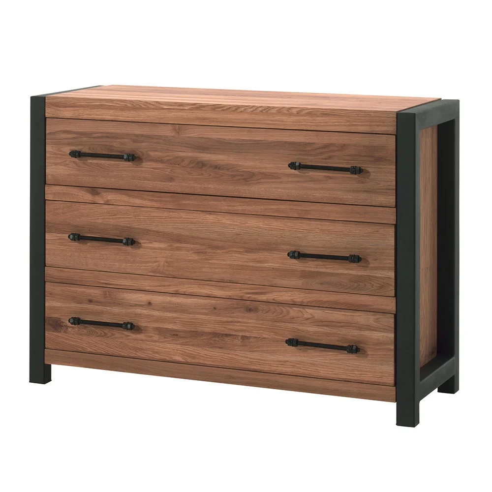 Commode trois tiroirs de la collection CATANE une création de chez Casita structure en chêne massif huilé et piétement en métal noir; Une commode en bois de chêne huilé et métal pour une chambre originale
