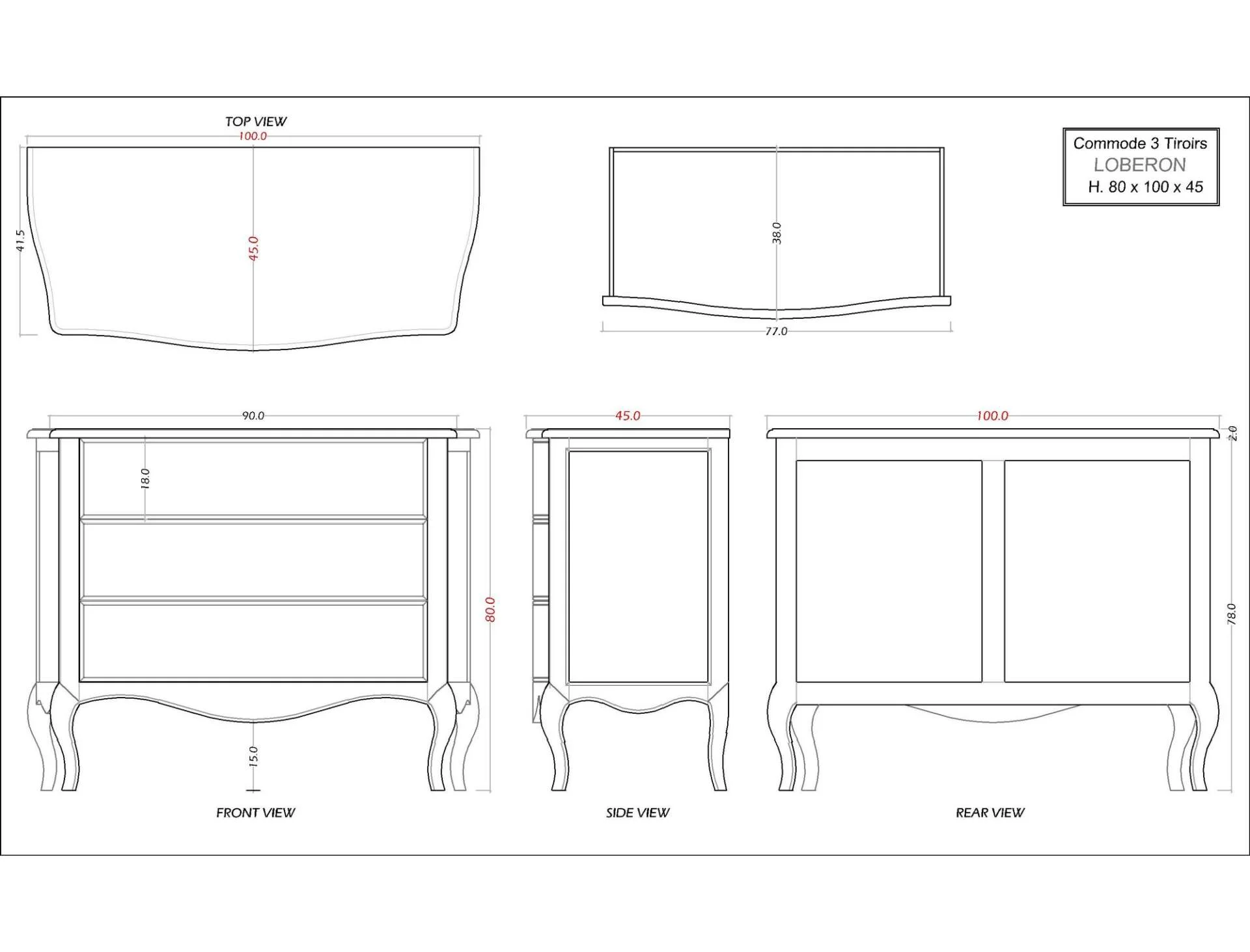 Cette commode de 100 cm est en bois finition vernis pour les tiroirs et le dessus.