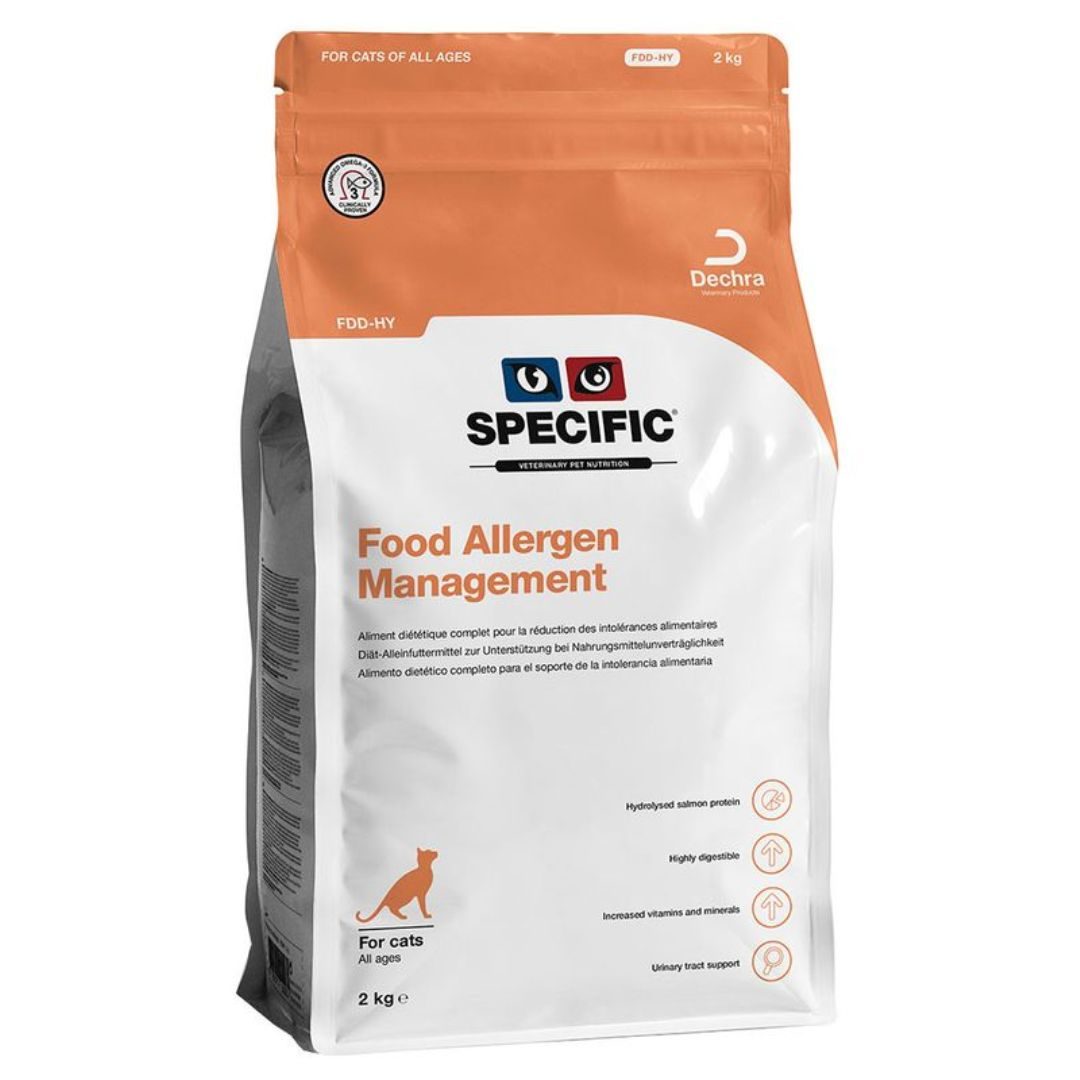 Découvrez les croquettes pour chats FDD HY Food Allergen Management de la marque Specific. Elles sont spécialement conçues pour les chats présentant des intolérances à certains ingrédients et nutriments, ces croquettes aident à réduire les troubles dermatologiques et gastro-intestinaux associés.
