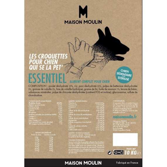 Ces croquettes de la gamme Essentiel pour chiens de la marque Maison Moulin sont formulées :