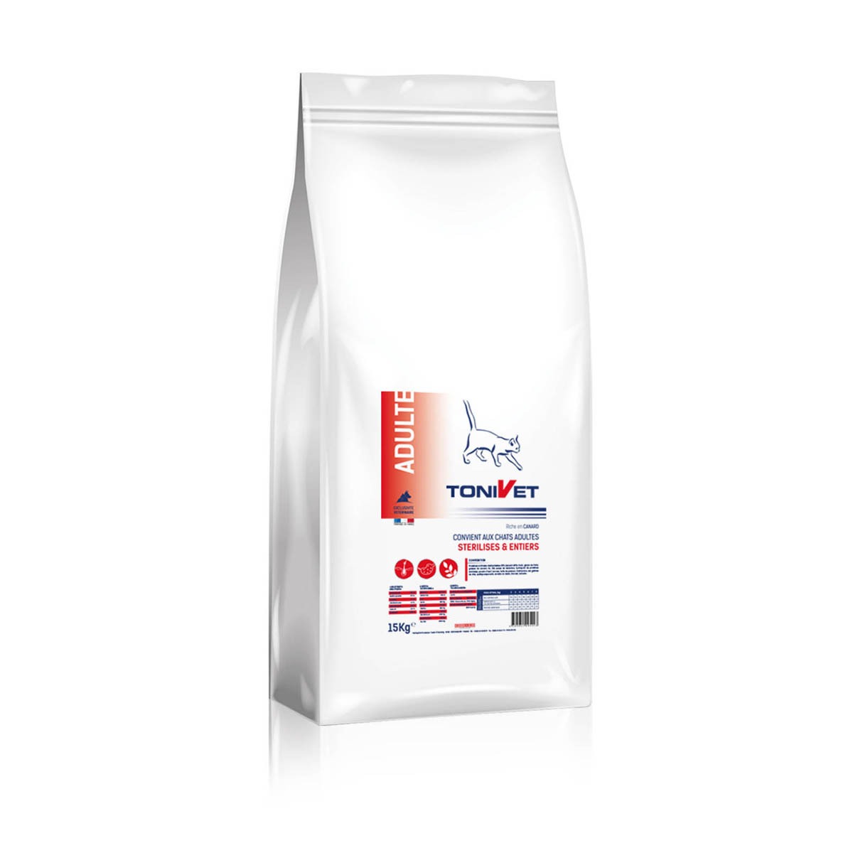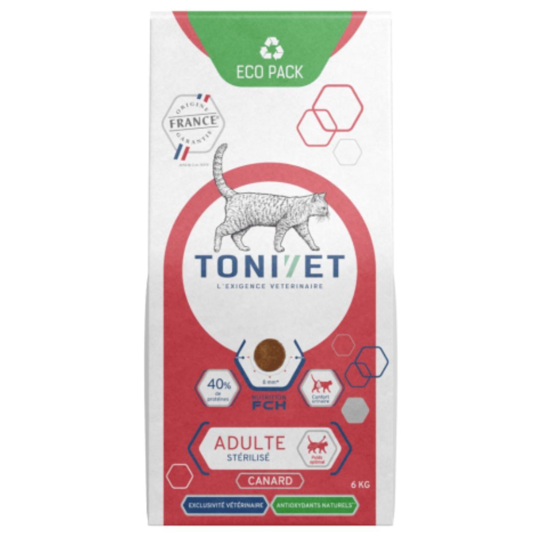 Les croquettes pour chats au CANARD de la marque TONIVET Physio sont spécialement forumulées pour les chats adultes: