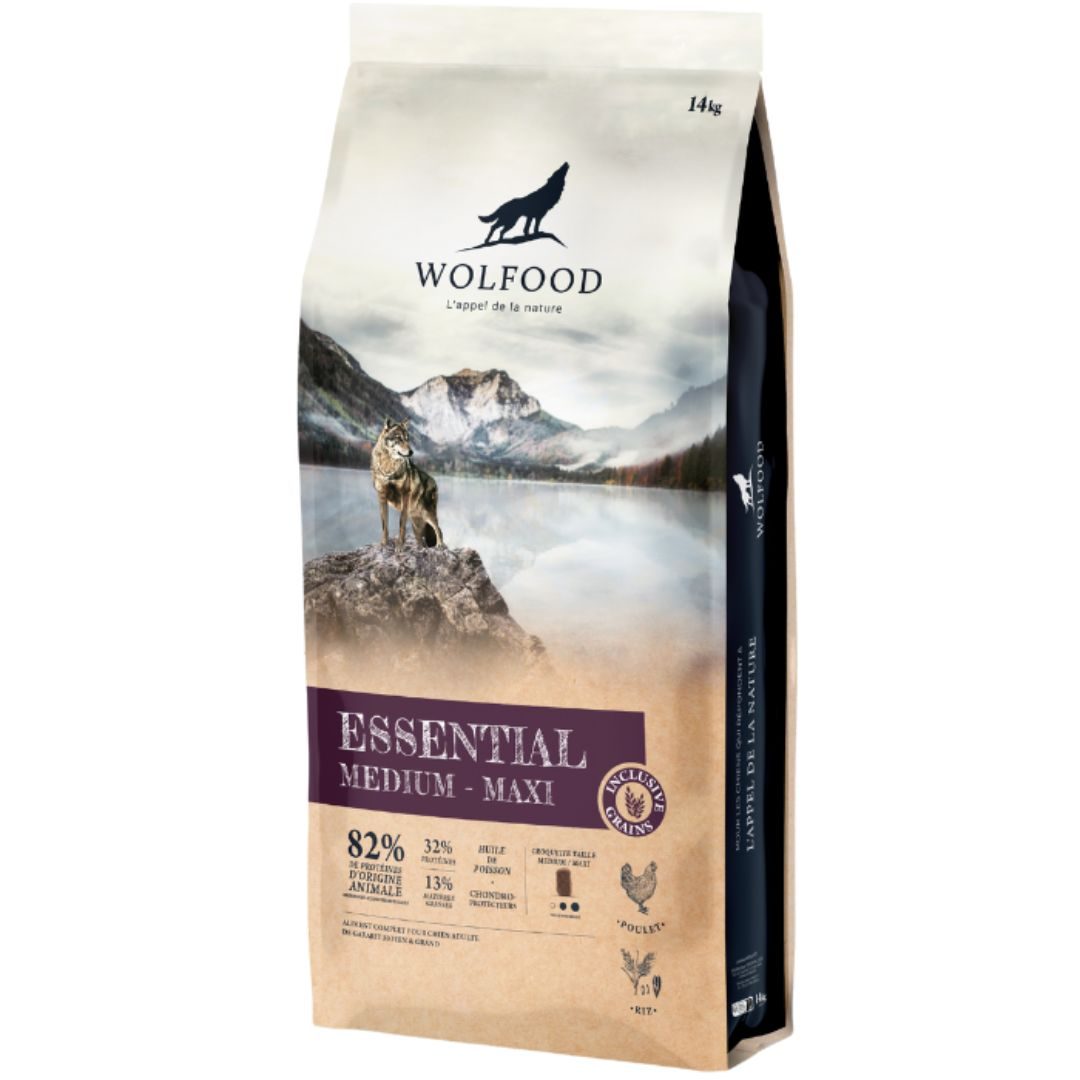 Découvrez les croquettes Essential Adult Medium Maxi de chez Wolfood : l’alimentation premium pour chiens adultes de taille moyenne à grande.