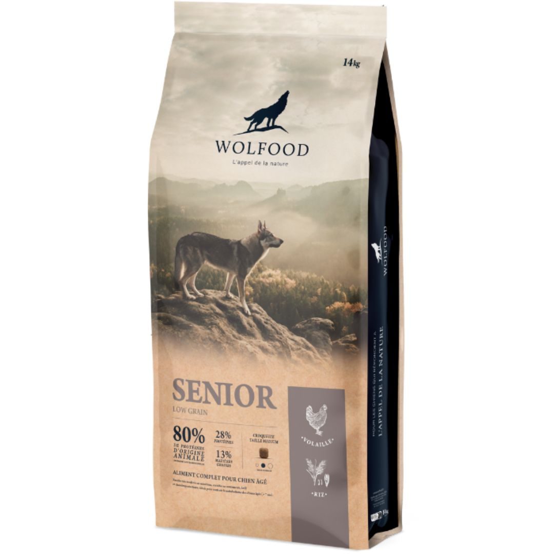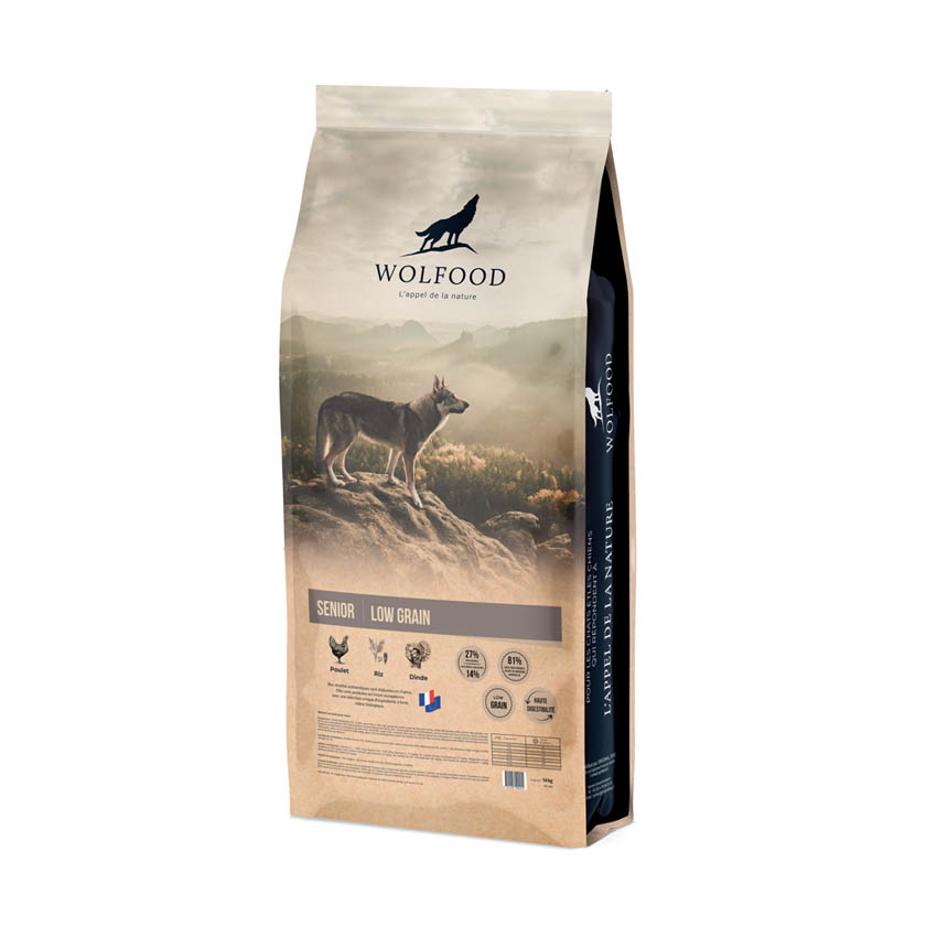 Les croquettes WOLFOOD SENIOR, Low grain sont savoureuses et uniques pour répondre aux besoins des chiens âgés.