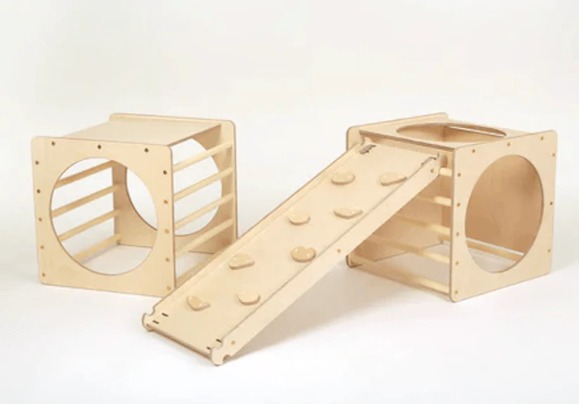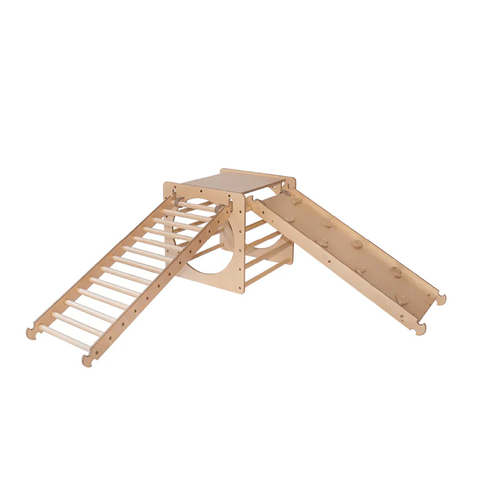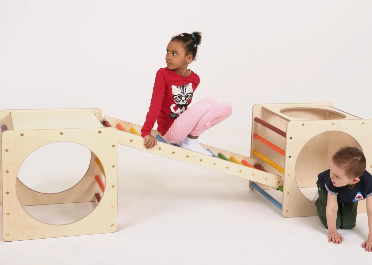 - Les rampes et échelles incluent des sangles de sécurité pour les attacher au cube et/ou au triangle de Pikler.