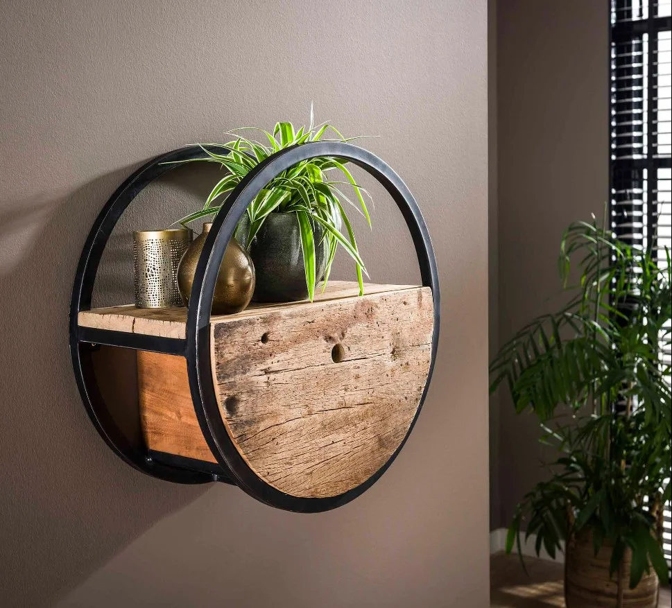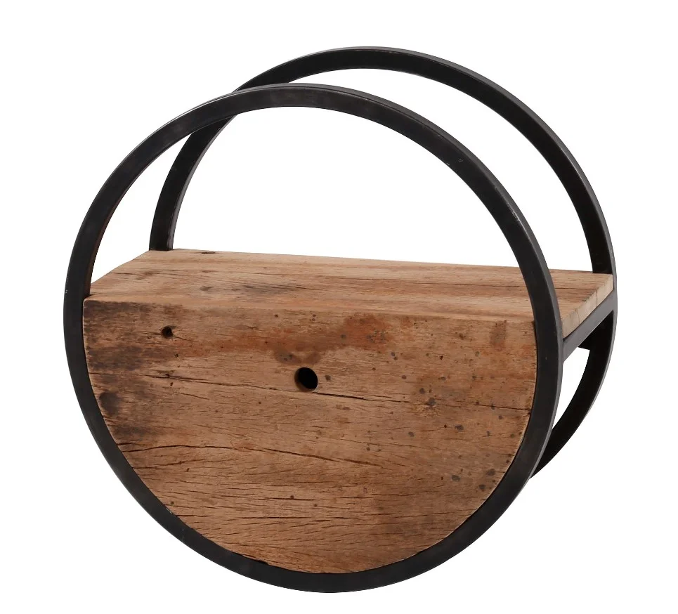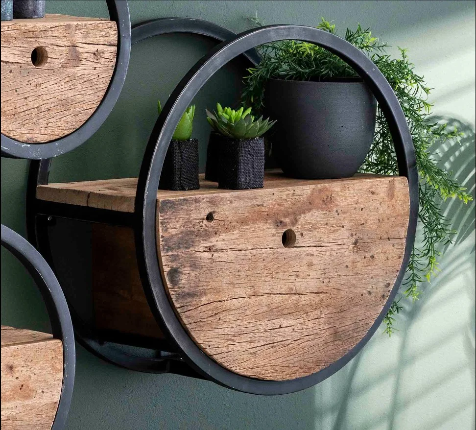 Grandiose, cette étagère ronde s’inspire d’une époque prospère où le bois et l’acier régnaient en maître.