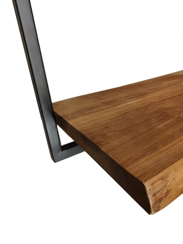 Belle étagère en métal noir avec un rayon en bois de teck massif