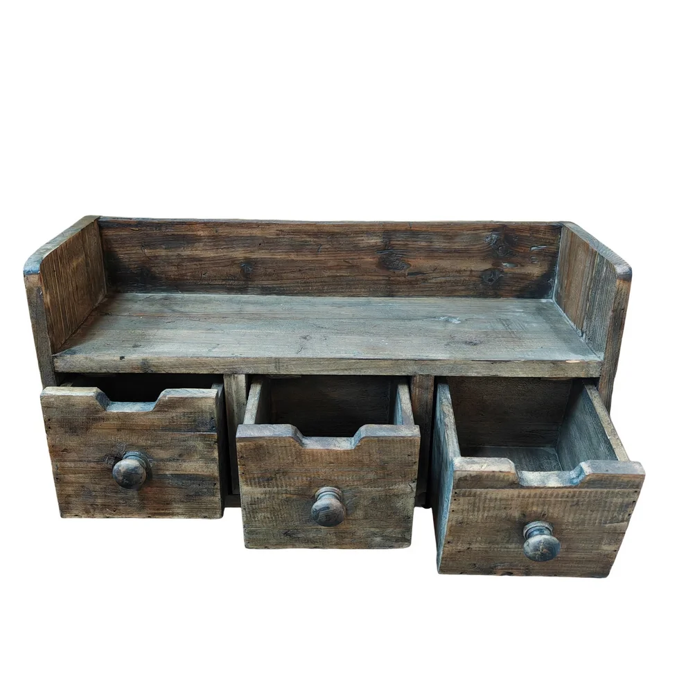 En bois vieilli , avec poignées, cette étagère est pourvue de trois tiroirs en bois.