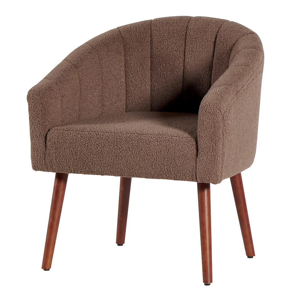 Un beau fauteuil en tissu bouclé « façon laine de mouton » couleur taupe avec une assise de 46 cm de hauteur