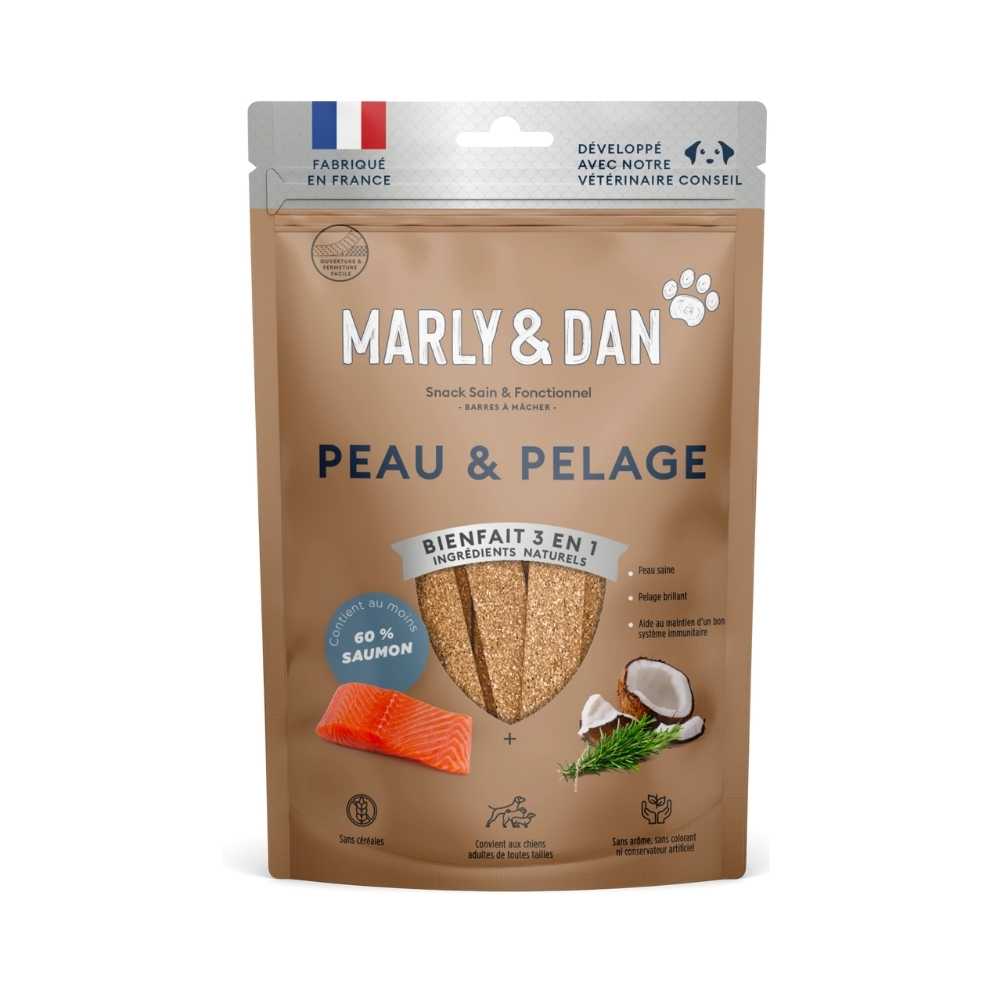 Délicieux snack sous forme de barre à mâcher de la marque française Marly & Dan à base de saumon et d’ingrédients végétaux naturels.