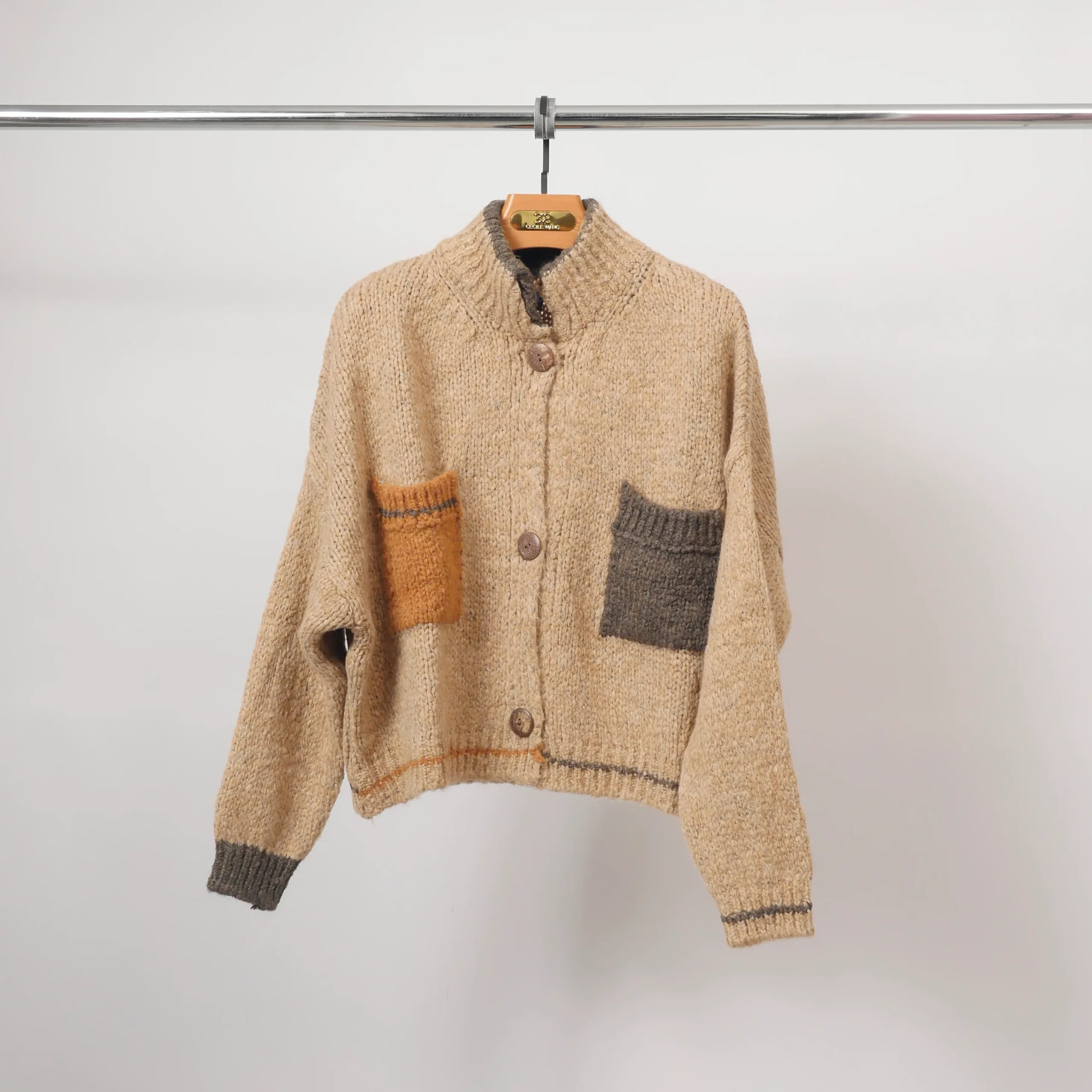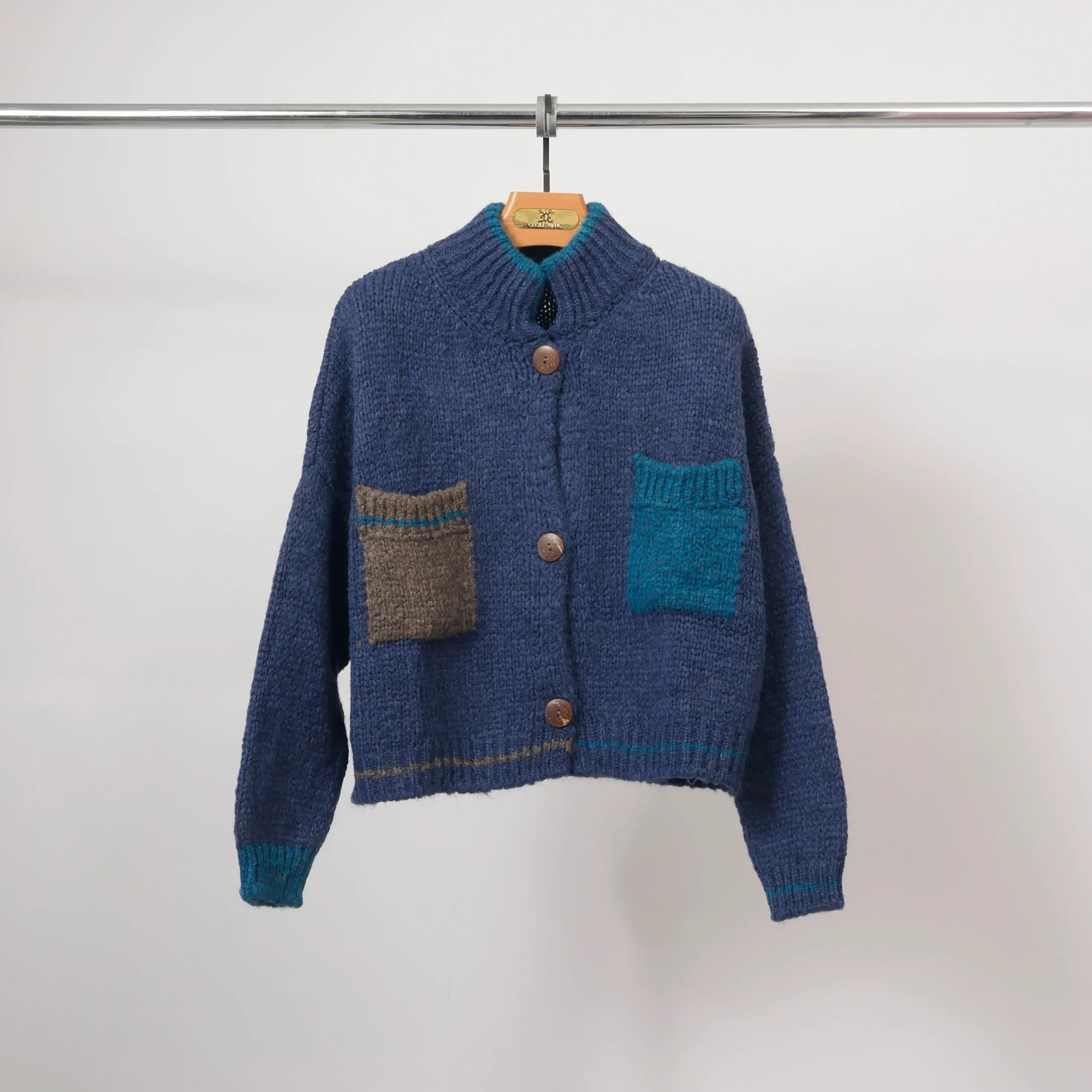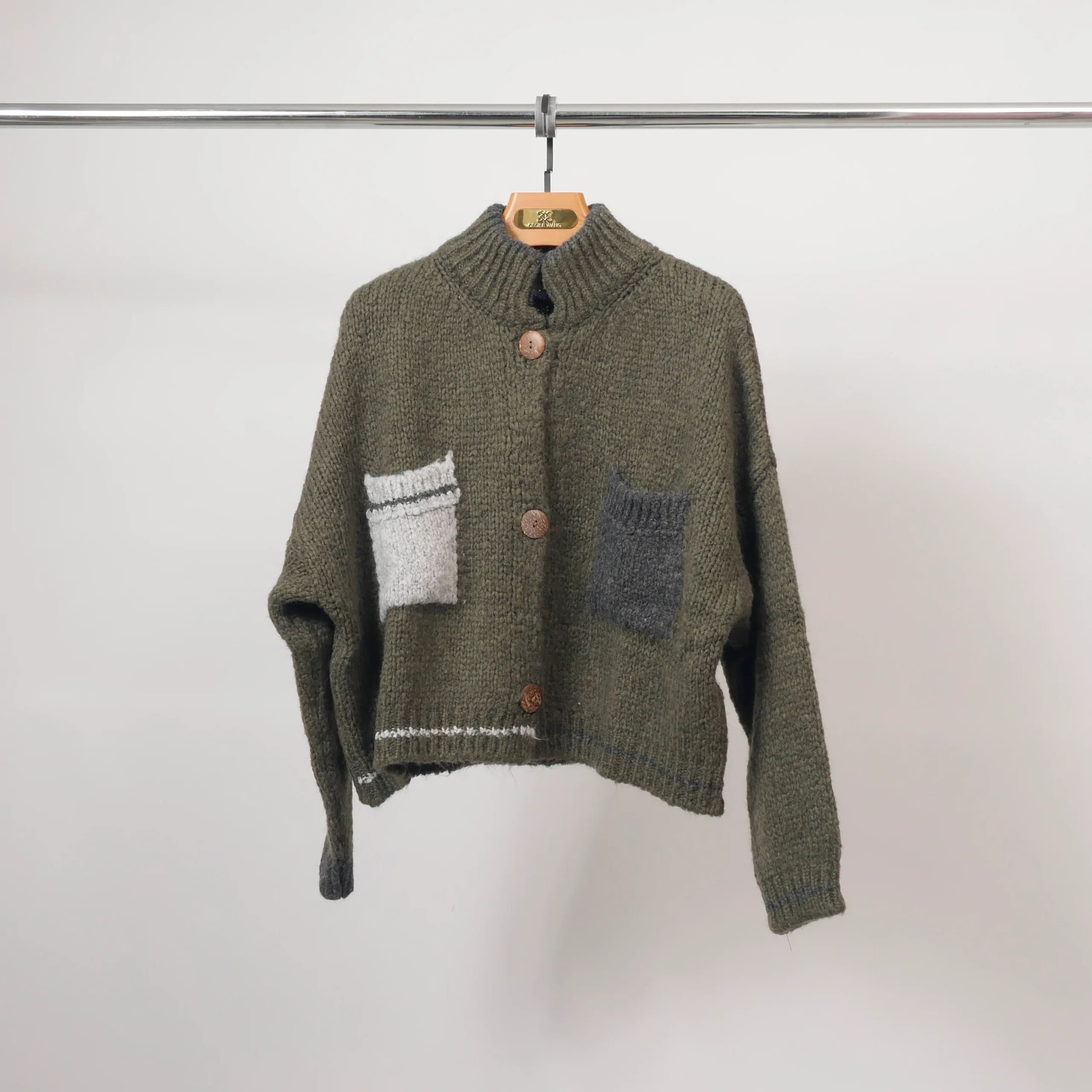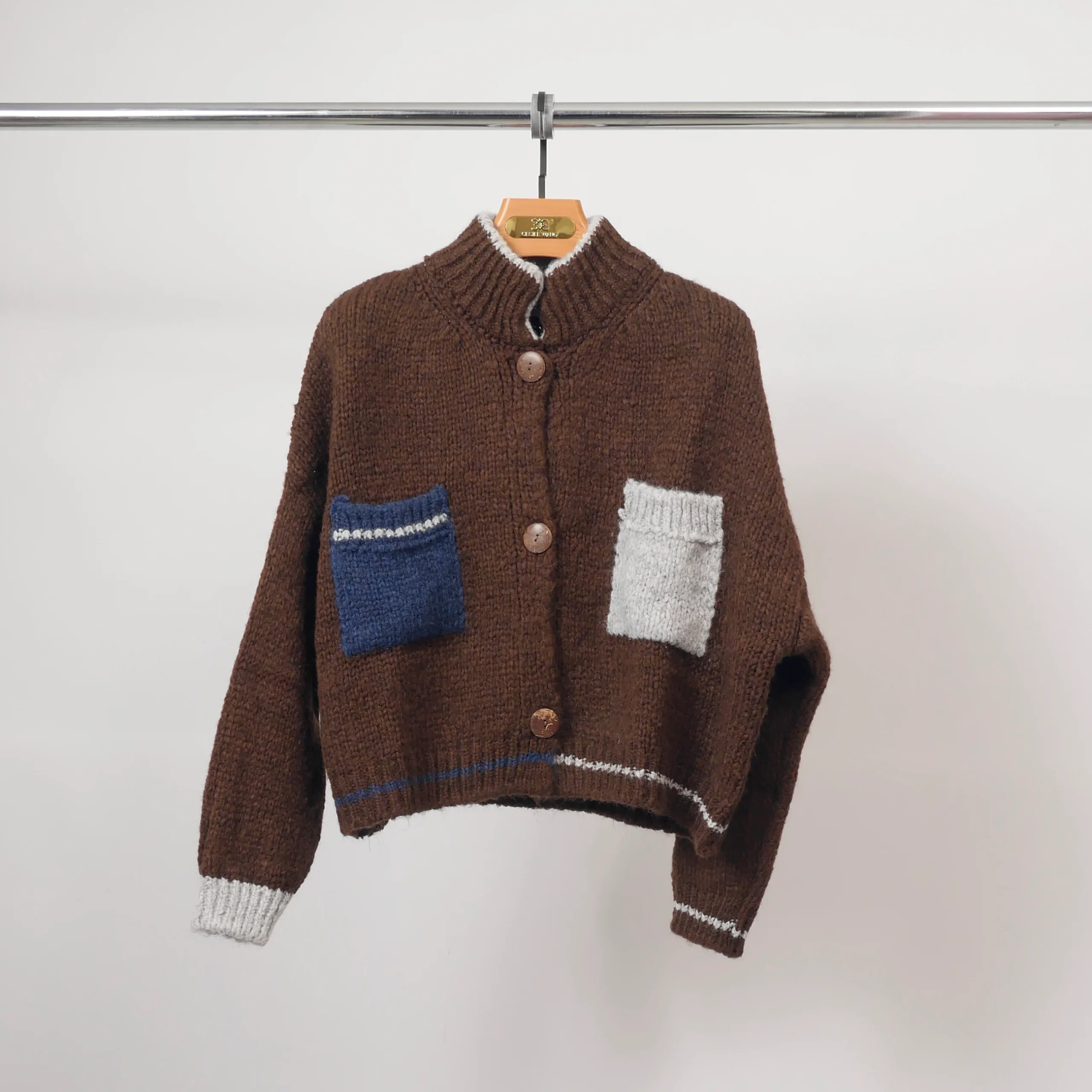 Confectionné dans une maille épaisse au tombé souple, ce gilet présente une coupe droite légèrement raccourcie, idéale pour équilibrer les volumes avec un pantalon taille haute ou une jupe fluide. Son col montant côtelé, ses gros boutons effet bois et ses poches plaquées multicolores en font une pièce à la fois originale et confortable.