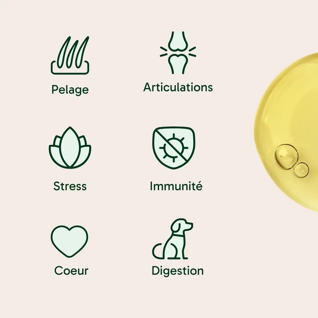 • Protection de l’organisme : Grâce à ses propriétés antioxydantes et anti-inflammatoires, cette huile aide à protéger le corps de votre chien contre les dommages causés par les radicaux libres et à réduire l’inflammation.