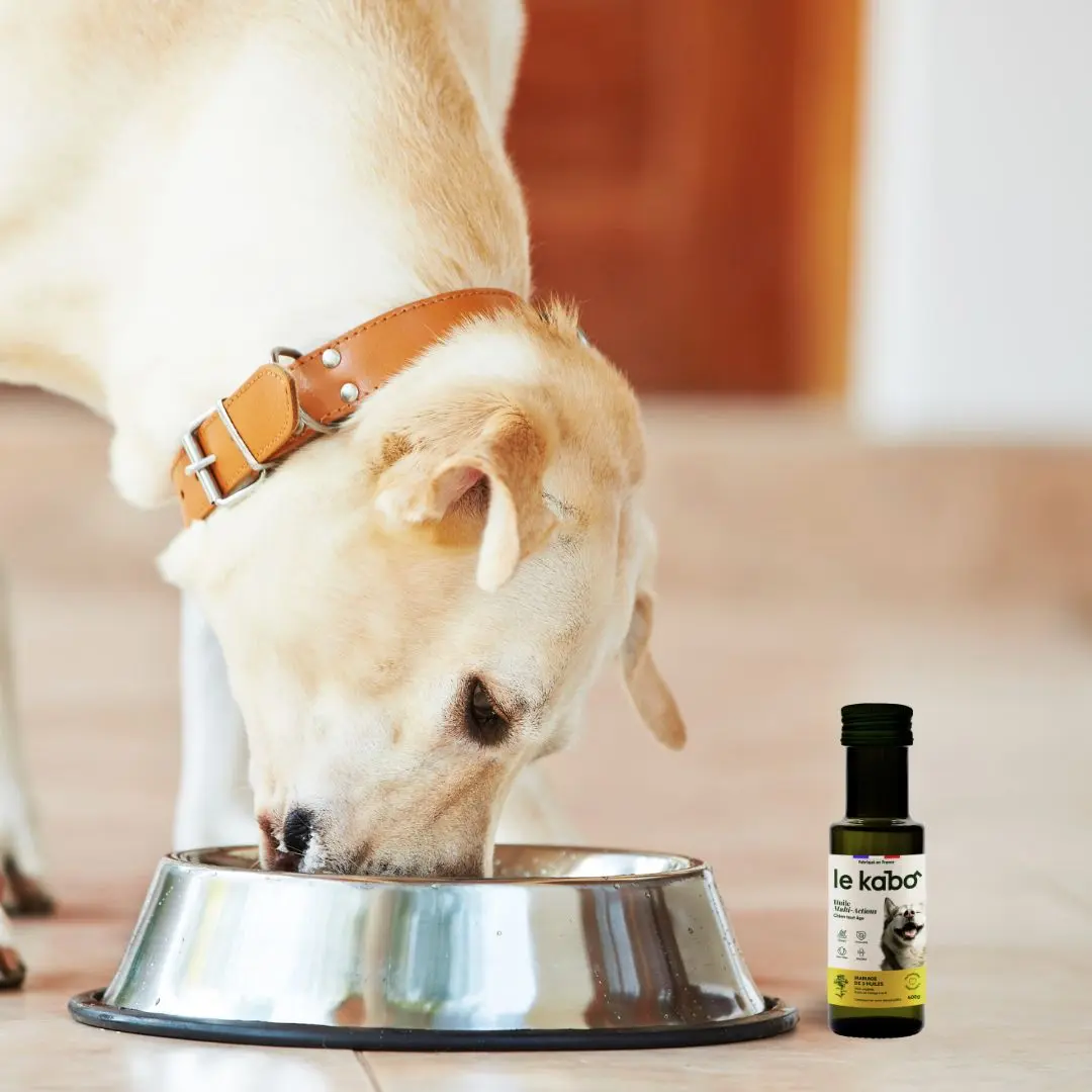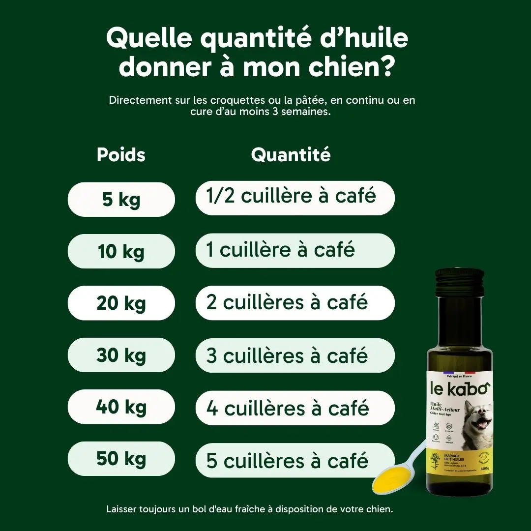 “L’huile végétale Le Kabo est un complément alimentaire précieux, riche en oméga 3 et 6. Elle peut être bénéfique pour divers besoins de votre chien, tels que lors des périodes de mue, pour soutenir le système immunitaire, soulager les démangeaisons chroniques, stimuler l’appétit ou gérer le stress, tout en s’ajoutant aux traitements recommandés par votre vétérinaire. De plus, elle contribue à rendre le pelage de votre chien brillant et en pleine santé.”