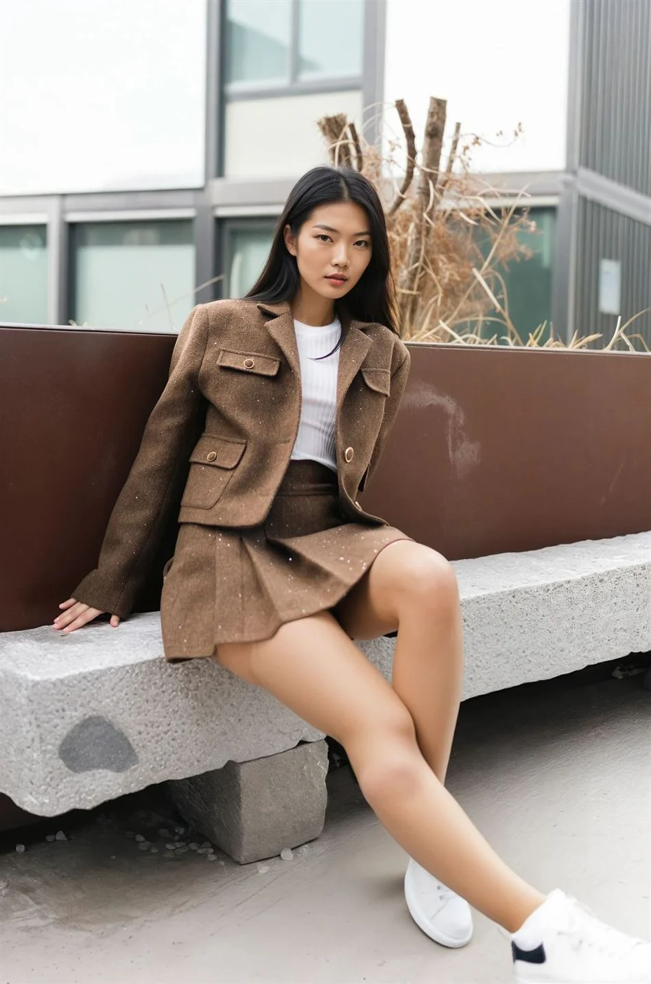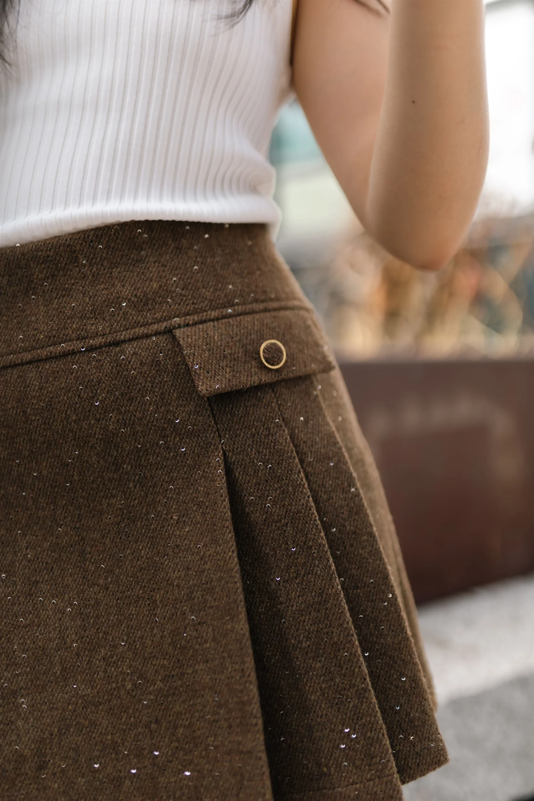 Cette jupe courte se distingue par ses plis larges pour un mouvement fluide et dynamique, complétés par deux poches à rabat ornées de boutons dorés, façon poches cargo revisitées. Le tissu texturé en laine mélangée, parsemé de sequins discrets, apporte une touche d’éclat sans ostentation. Sa taille haute souligne la silhouette, tandis que sa coupe évasée flatte toutes les morphologies. Portez-la avec un top ajusté ou un pull en maille fine pour un look équilibré, ou optez pour la veste assortie pour un ensemble ultra tendance.