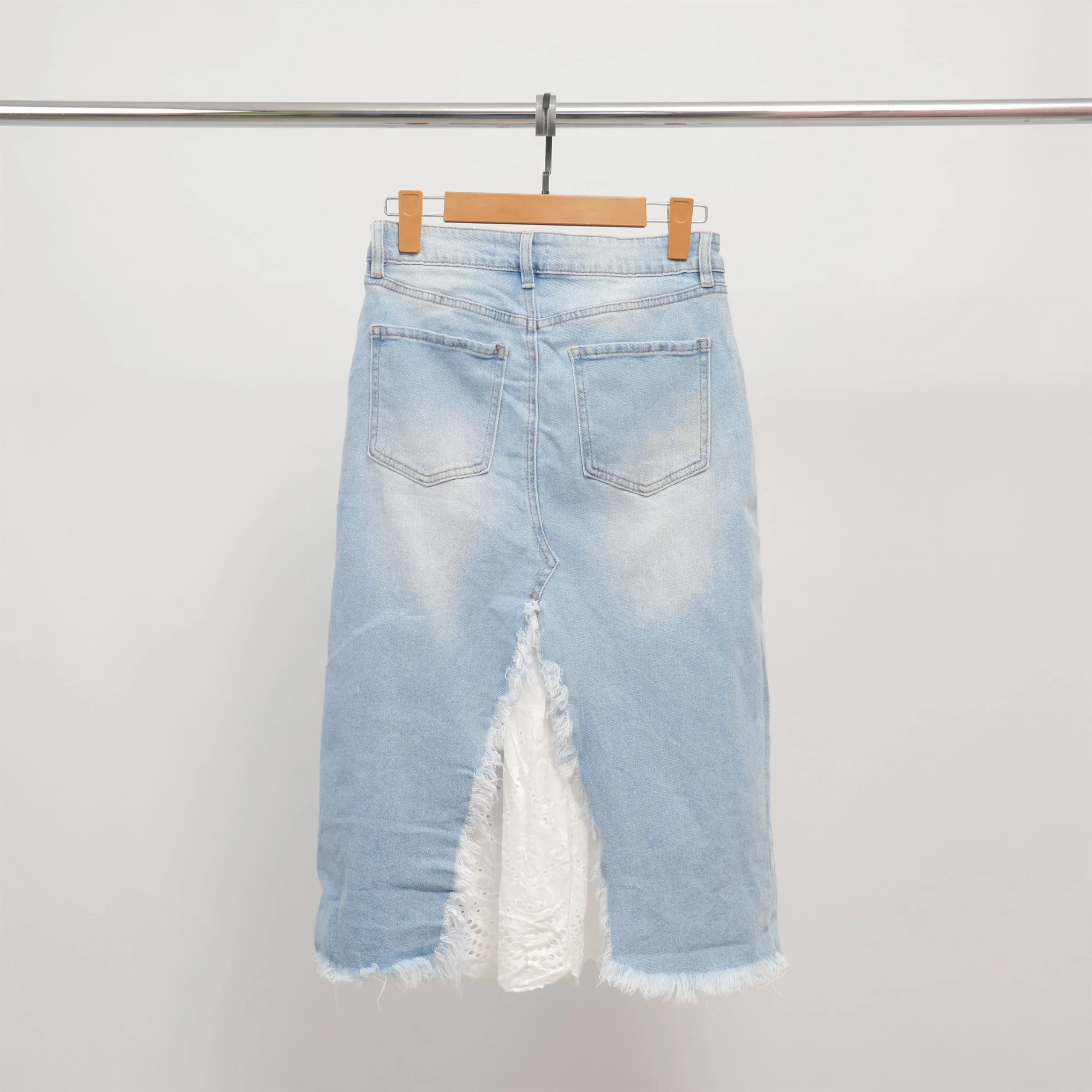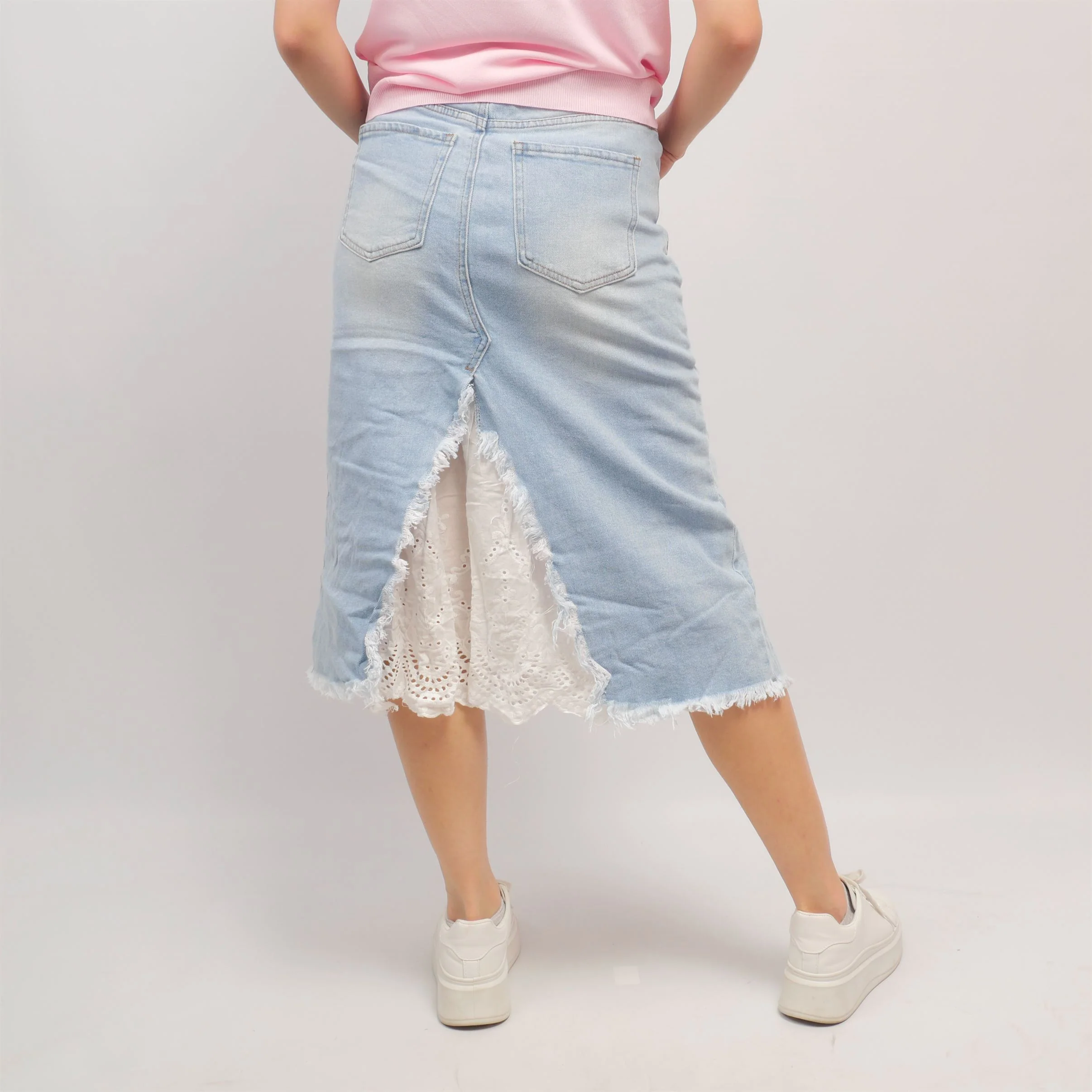 Cette jupe midi en jean délavé se distingue par sa fente devant et dos ornée d’un empiècement en broderie anglaise blanche, apportant une touche romantique à un esprit urbain. Les bords effilochés renforcent son style décontracté, tandis que sa coupe droite et sa taille haute flattent la silhouette.