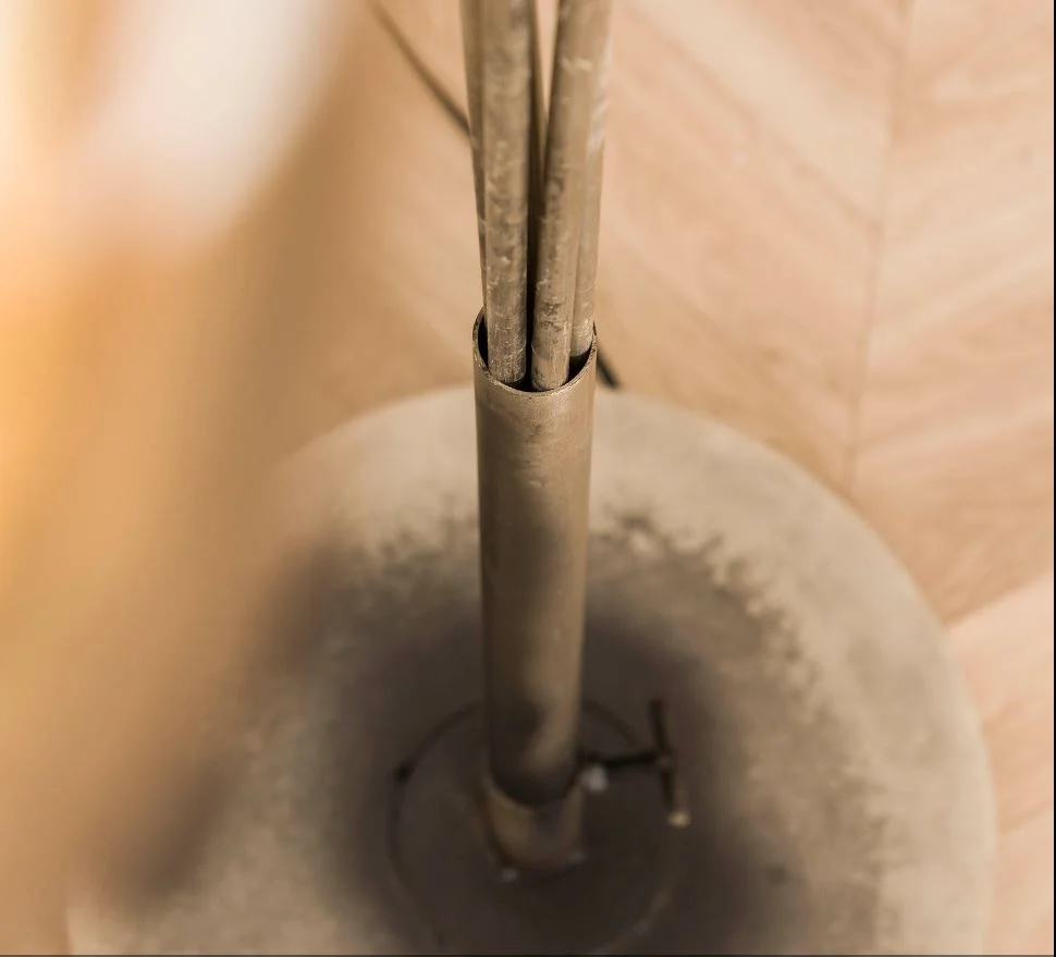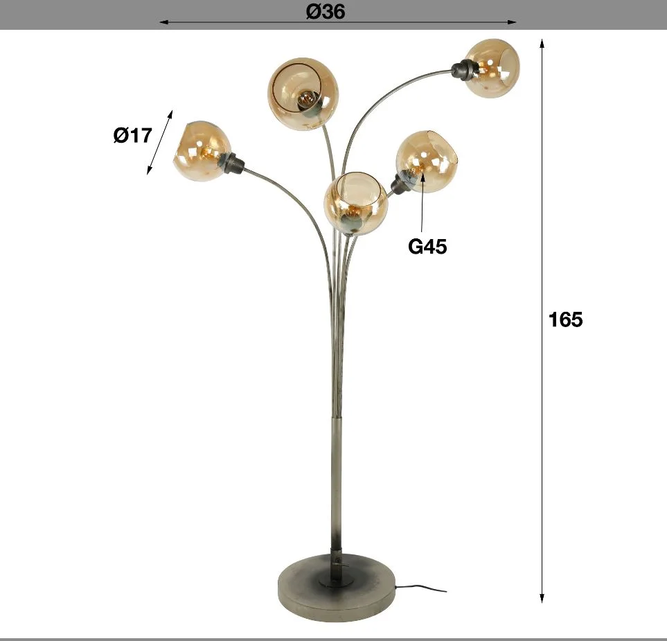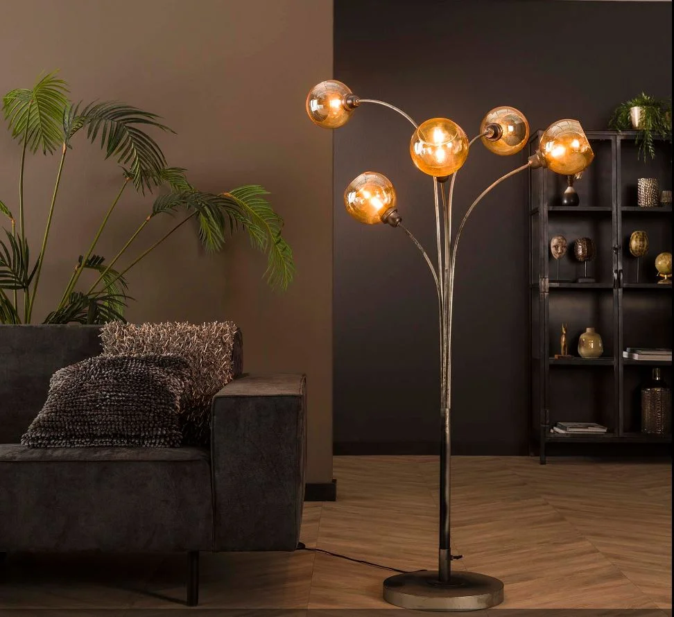 Lampadaire arbre Acier Peinture époxy aspect argent vieilli. Cette lampe est contemporaine et ludique Chaque lampe regardent toutes dans des directions différentes l’espace est dosé et bien Les verres sont de couleur ambre – Culot E27- Ampoule Conseillée LED A++ 7W équivalent