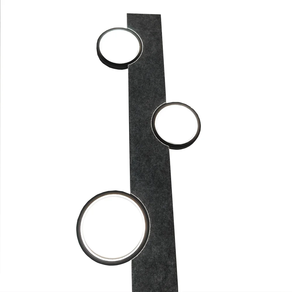 Lampadaire Interior au design moderne réalisé en aluminium pied central en tissu feutré, des anneaux de LED en aluminium et un support en métal. Ce lampadaire est à intensité variable avec une température de 4000K, qui correspond à une couleur blanc froid. Avec son design mélangeant les matières, il est très moderne. Placé dans un salon ou dans une chambre pour créer une ambiance chic et feutrée.