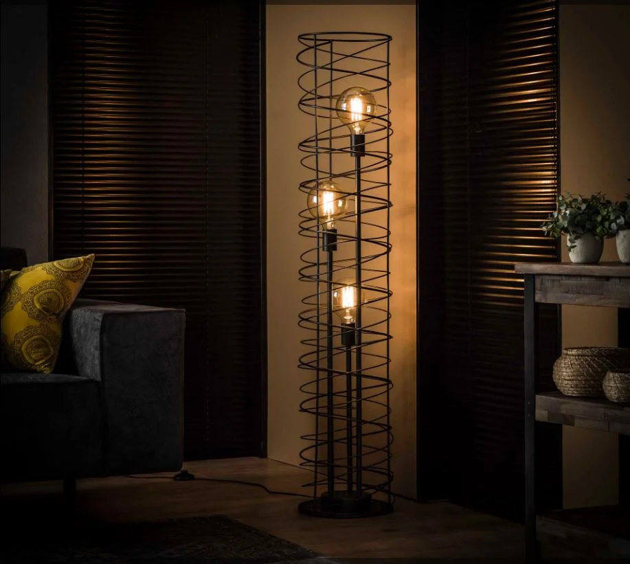 Lampadaire spirale en métal et fils de fer couleur charbon équipé de douille à vis type E27 avec trois points d’éclairage de hauteur différent