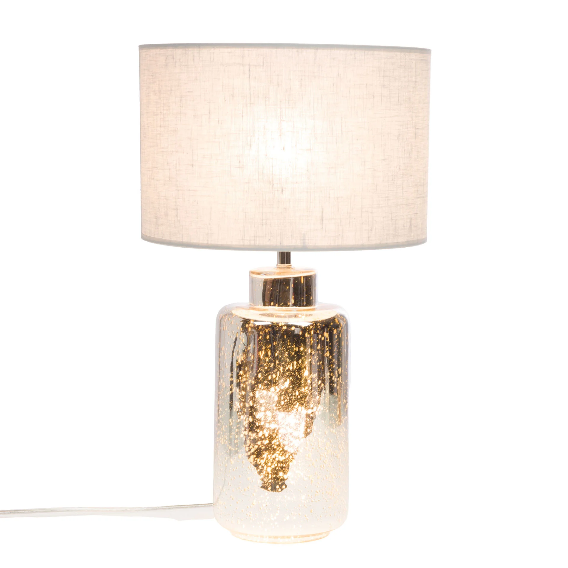 Cette lampe avec son abat-jour couleur lin cendre diffuse une lumière tamisé et la base du pied en verre mercurisé apporte une originalité à l’ensemble .